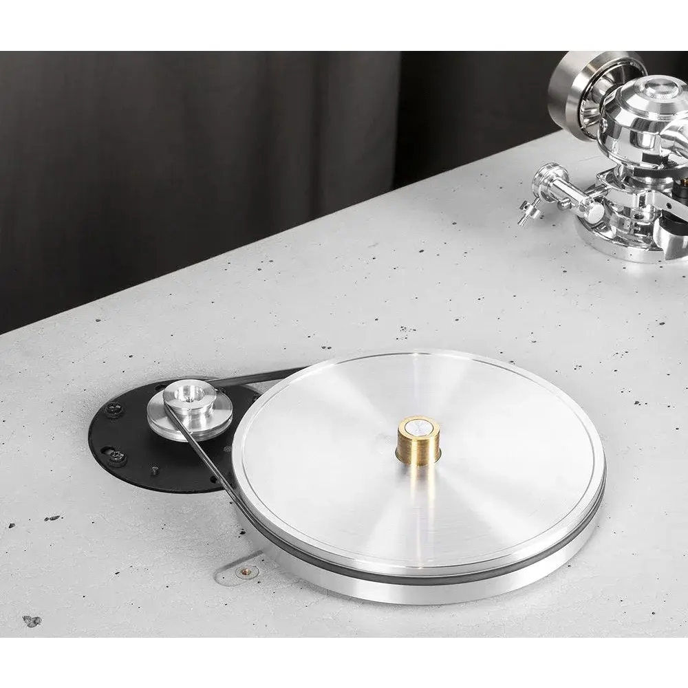 Алюминиевая пластина весом 5,2 кг установлена на полностью алюминиевую дополнительную пластину весом 900 г. Массивный перевернутый основной подшипник гарантирует бесшумное воспроизведение с точными скоростями. В подшипниковом узле массой 1,8 кг используется шпиндель из полированной нержавеющей стали с керамическим шариком наверху. Керамический шарик используется сверху, поскольку он очень твердый и инертный. Это, в сочетании с тефлоновой пластиной в качестве несущего зеркала, также является хорошим демпфирующим устройством. Точная посадочная поверхность из тефлона обеспечивает идеально плавное движение без какого-либо грохота.