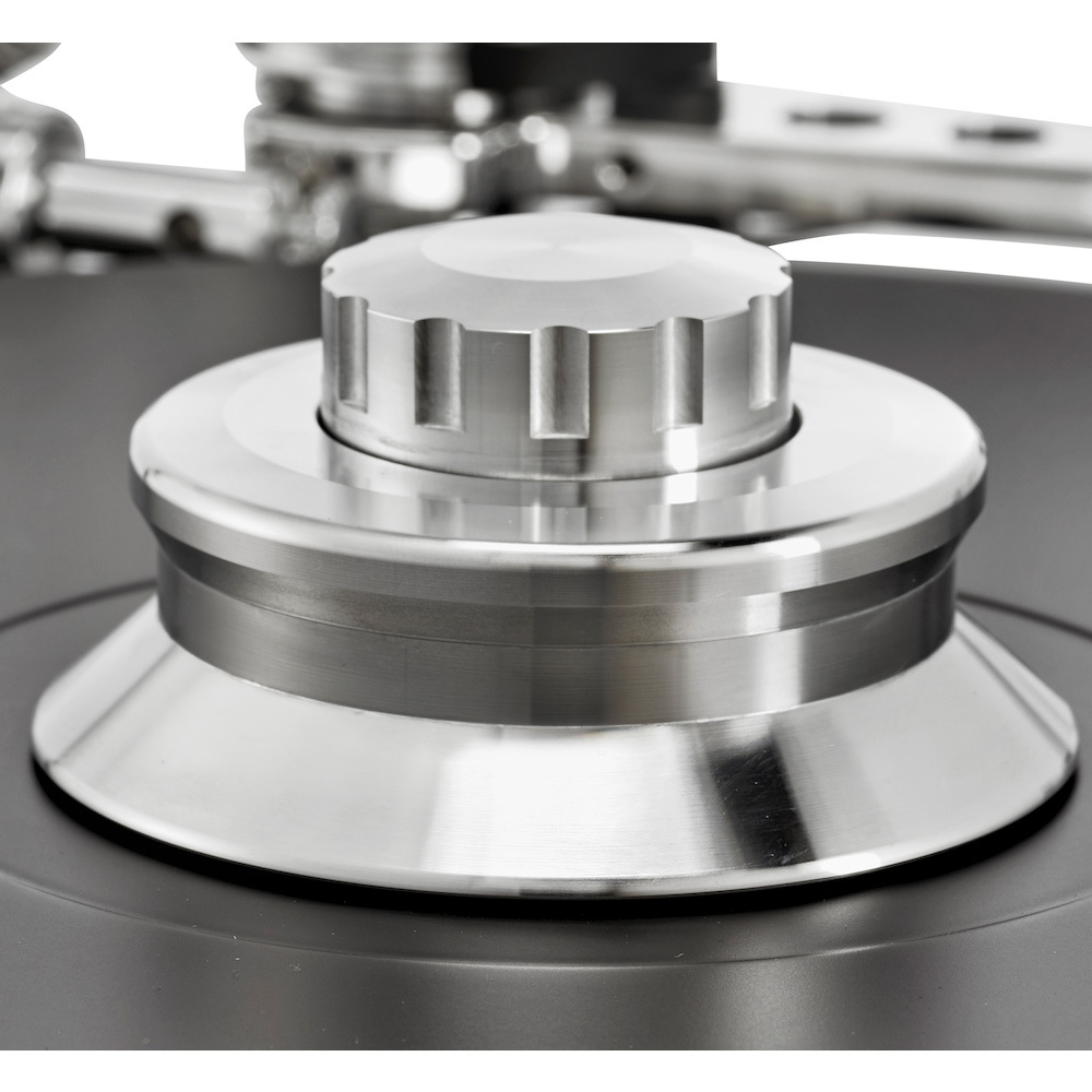 Как и во многих современных проигрывателях, в комплект поставки входит алюминиевая “шайба”, которая помогает удерживать пластинку на одном уровне с пластинкой. У этого конкретного проигрывателя есть ручка сверху, которая используется для фиксации шайбы на шпинделе проигрывателя.