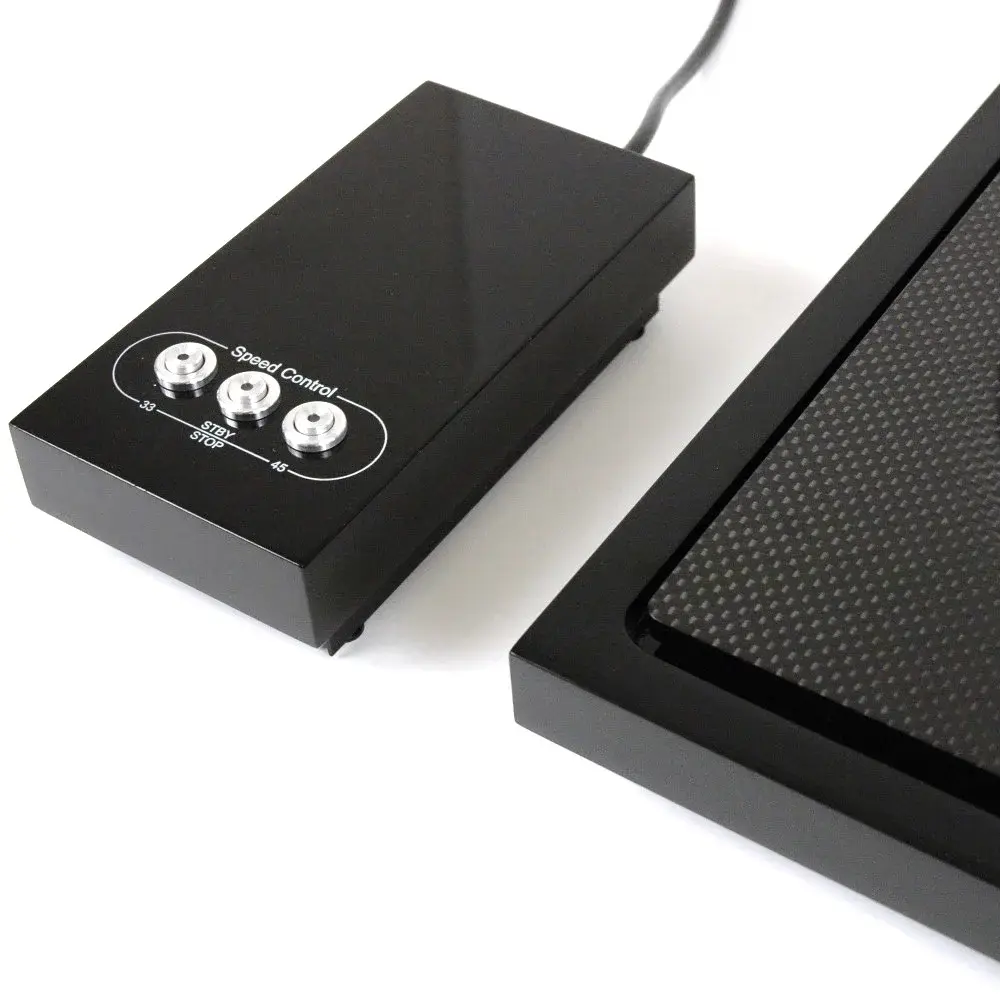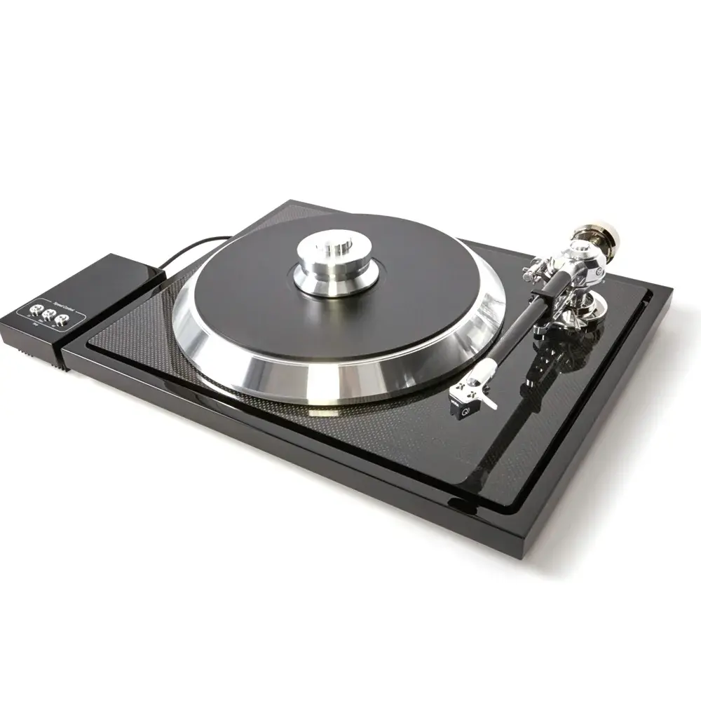 Подшипник представляет собой перевернутую конструкцию большого размера с инертным керамическим шариком, не вызывающим резонанса, сверху, вокруг подшипника мы устанавливаем сверхтяжелую точку массой 700 г, которая поглощает всю энергию вокруг. Жесткая углеродная подложка помогает передавать всю вибрацию в этой точке массы. Таким образом, вибрации передаются с помощью тепла. Само блюдо изготовлено из специального сплава очень инертного алюминия, а также демпфируется вставками из TPE - оно состоит из 2 частей, подложки и основной пластины, что позволяет ему оставаться плоским, несмотря на очень высокую массу и кинетическую энергию.