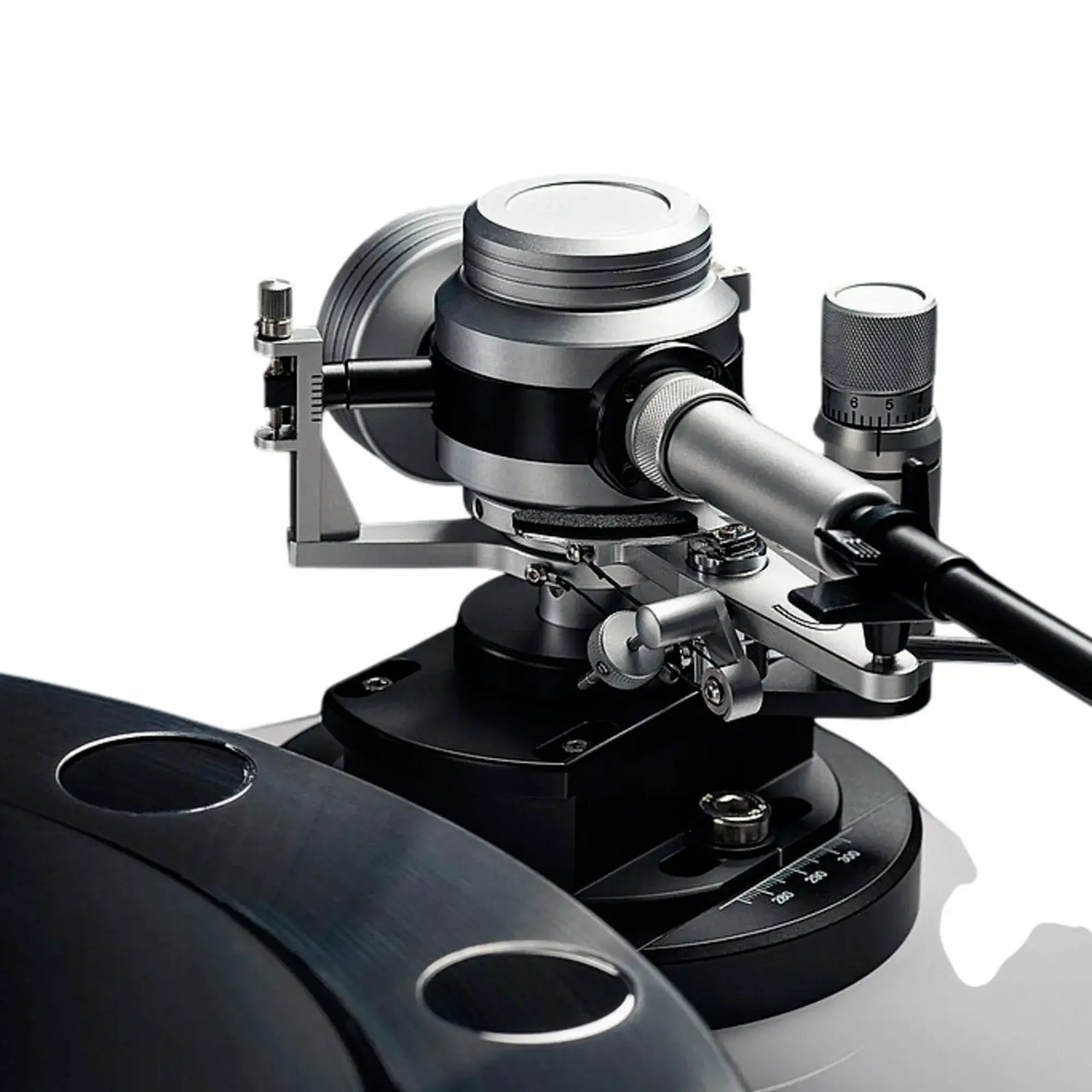 В верхней части подшипника установлен шарик, изготовленный из очень твердой и инертной керамики. В комбинации с тефлоновым основанием в качестве зеркала подшипника эта конструкция обладает хорошими демпфирующими свойствами. Гладкая тефлоновая поверхность обеспечивает исключительно плавное вращение без рокота. Опорный диск использует подвес из неодимовых магнитов. При этом маленькие магниты не оказывают влияния на звукосниматель, поскольку находятся далеко от него. Благодаря магнитному подвесу мы можем вращать диск очень большой массы, практически не создавая нагрузки на подшипник. При этом вращение не сопровождается рокотом. (Утяжеленный диск, как правило, создает высокий уровень рокота). Нагрузку на подшипник можно регулировать. Разные подходы позволяют по-разному справиться с этой задачей. На проигрывателях Forte она регулируется на слух согласно вашим индивидуальным предпочтениям.