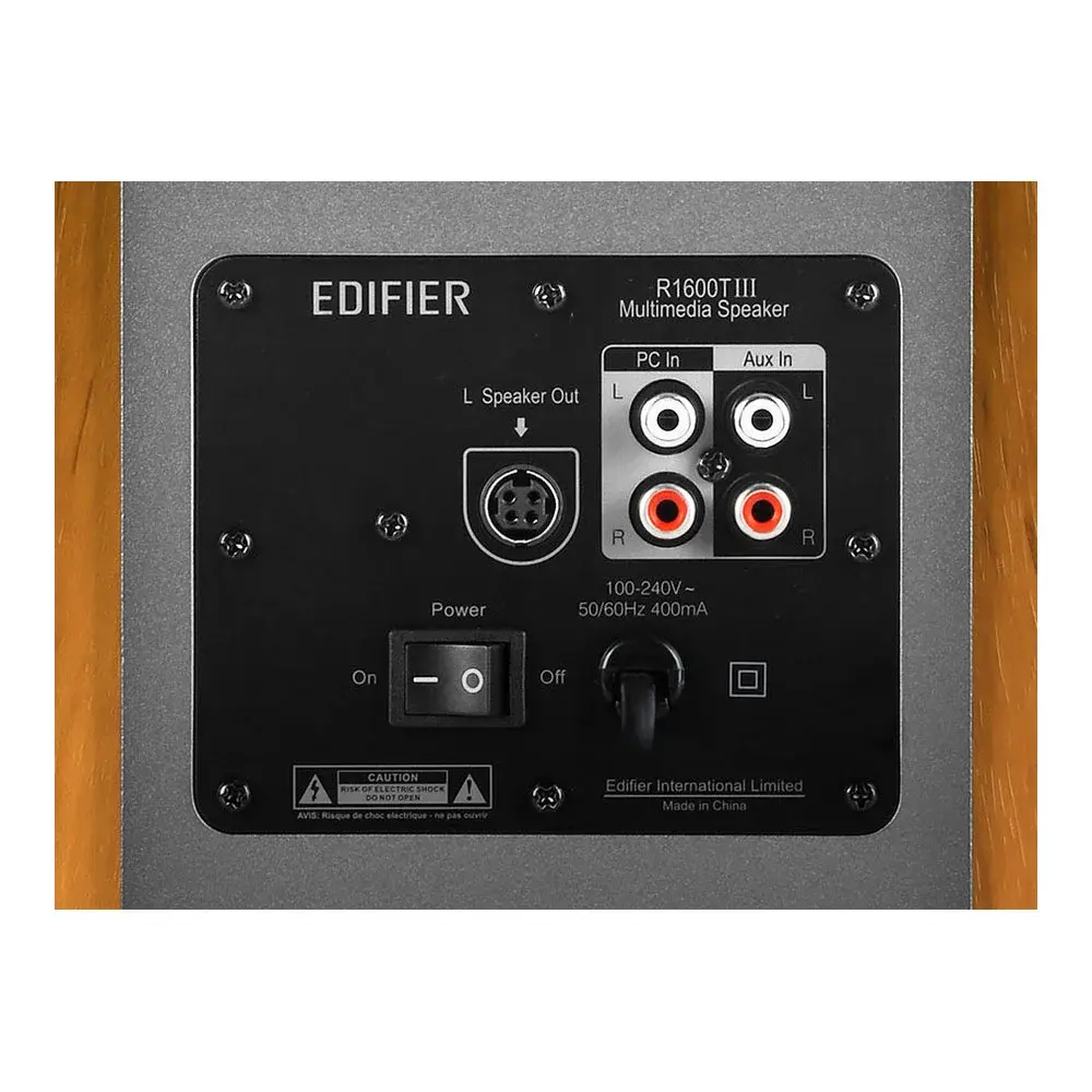 В системе используется усилитель профессионального уровня с выходными каскадами в режиме класса D. Панель коммутации расположена на боковой стороне корпуса активного сателлита, есть возможность регулировки громкости, высоких и низких частот. В комплект поставки входит беспроводной пульт ДУ с возможность регулировки громкости или временного блокирования звука. «Честная» (RMS) выходная мощность системы Edifier R1600TIII составляет 2 х 30 Вт.