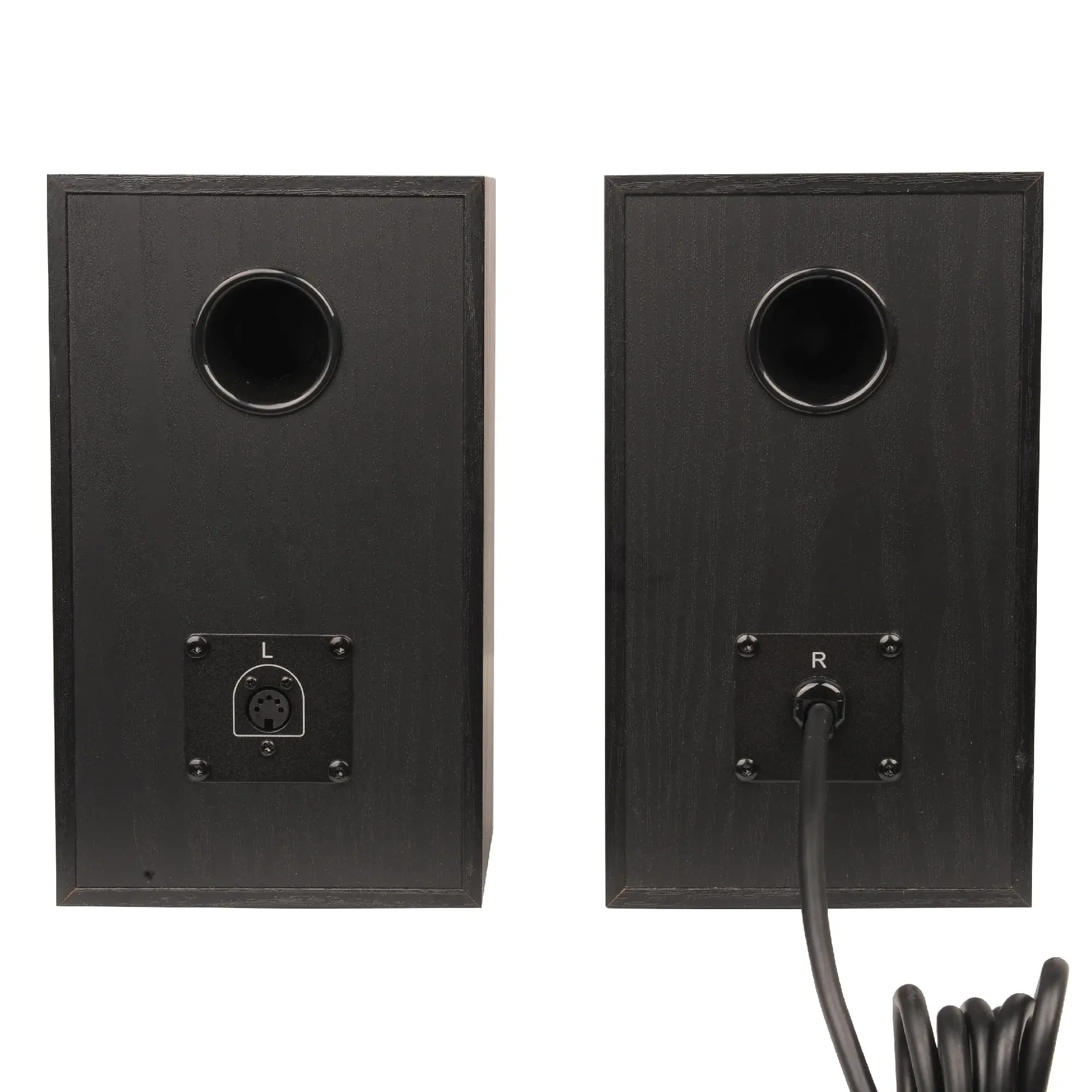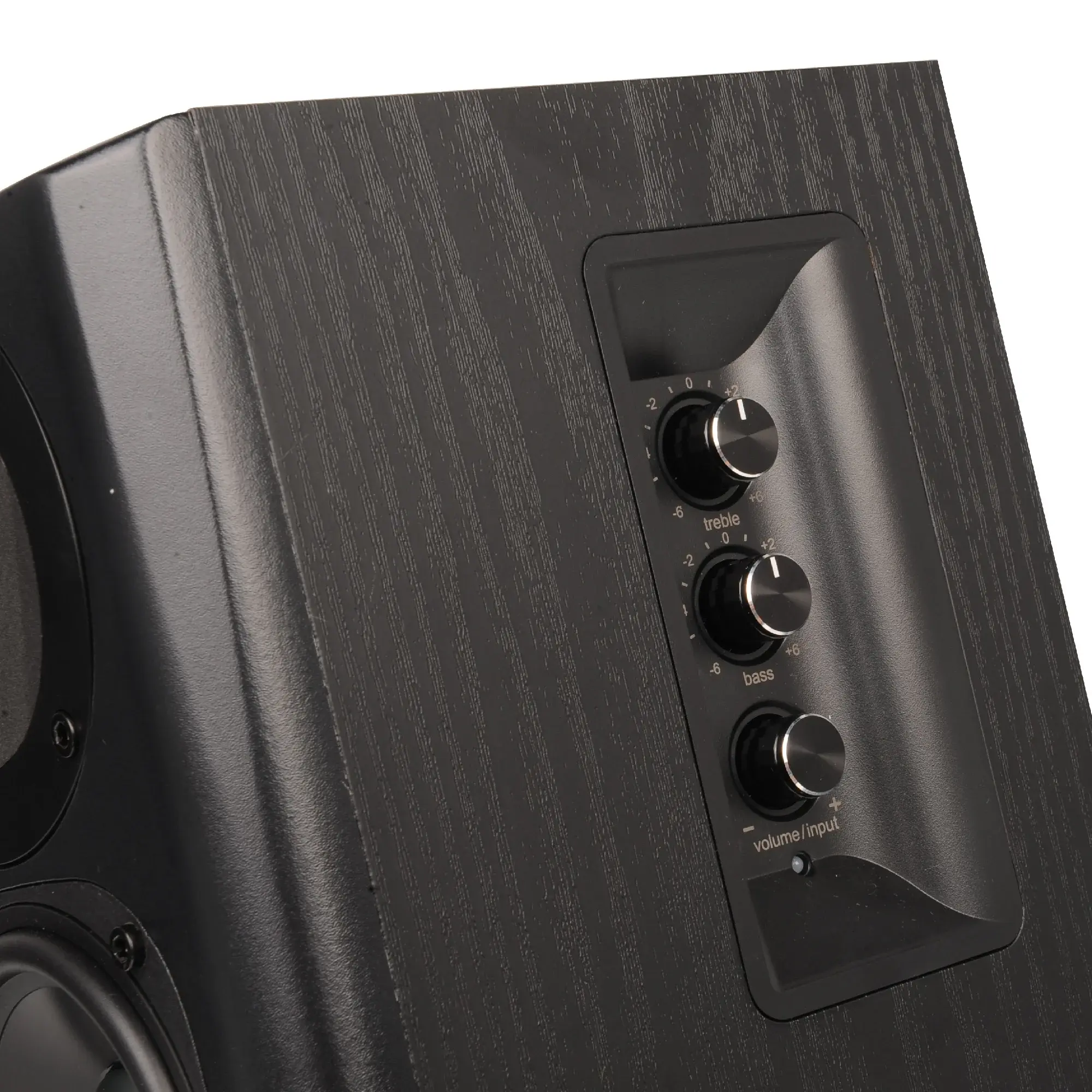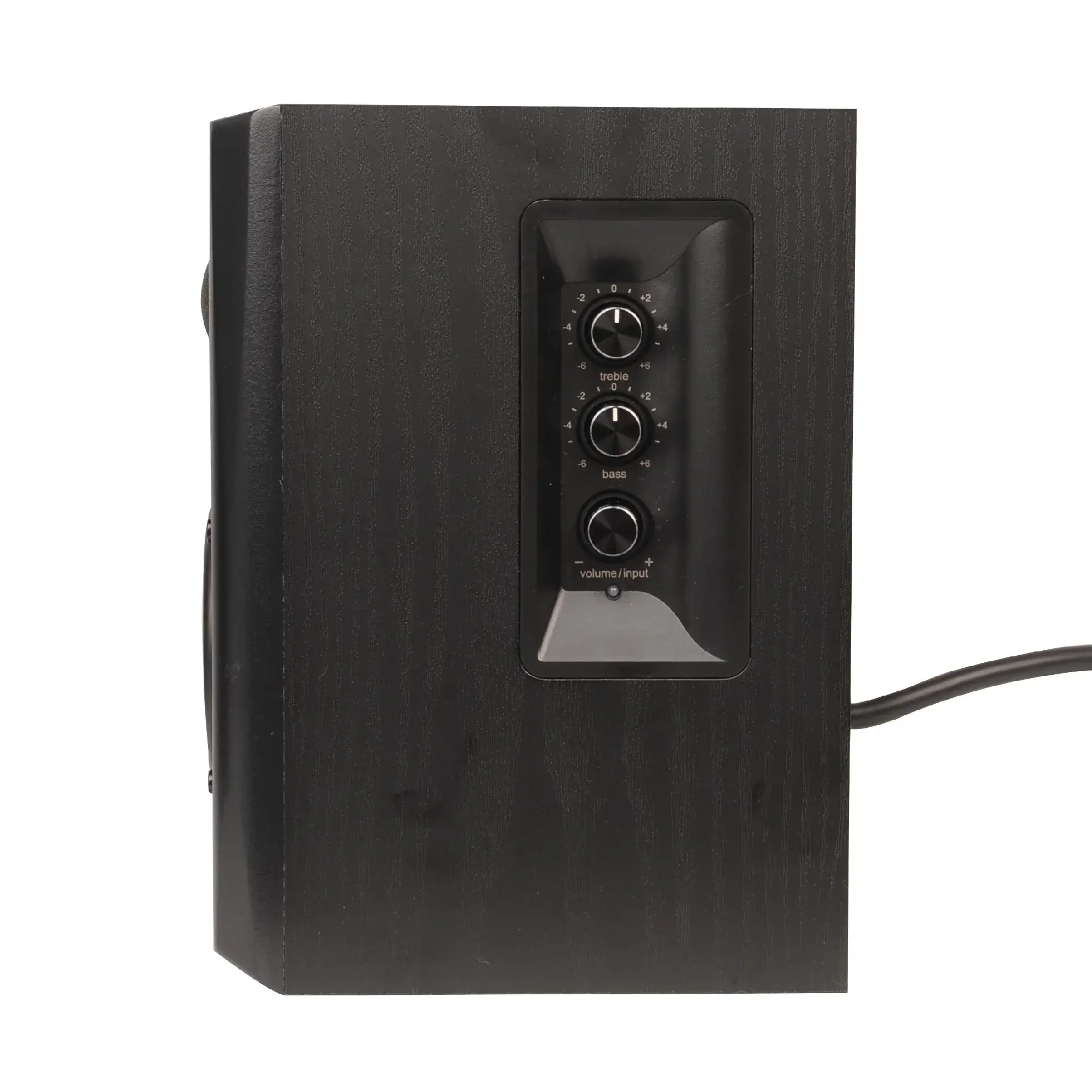 Материал корпуса, выполнен из древесной плиты толщиной 14 мм (сателлиты – 10мм), покрыт виниловой пленкой цвета темного дерева. Сам размер сателлитов заметно больше предыдущей модели. Отсутствие грилей позволяет демонстрировать впечатляющие титановые и алюминиевые диффузоры динамиков сателлитов. На правом сателлите расположены регулировки основных параметров звука.
