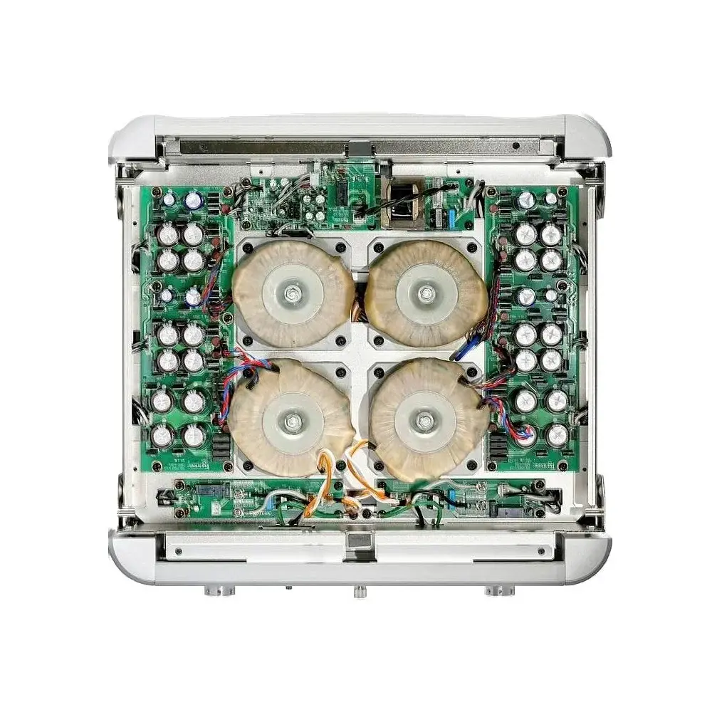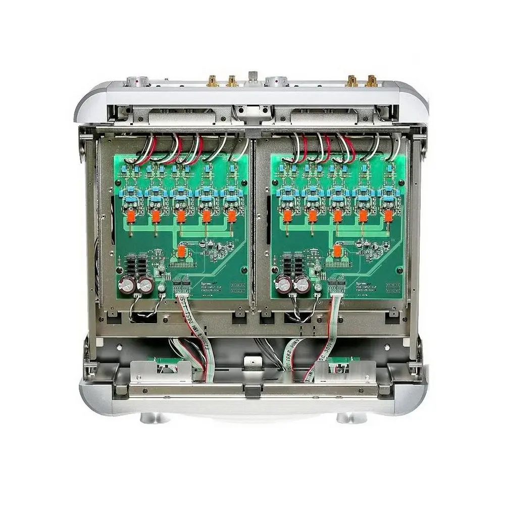 Основной блок C1 состоит из двух моноблочных предусилителей и модуля логического управления. Входная и выходная секции каждого предусилителя построены на отдельных платах, которые расположены одна над другой - в целях минимизации длины пути сигнала. Эти модули монтируются на уникальной пружинной системе, типа рессорной подвески, которая изначально разрабатывалась для топовых моделей SACD-плееров Esoteric. Такая «плавающая» конструкция помогает добиться полной независимости левого и правого каналов, а также усиливает ощущение пространственности и легкости в звучании. Блок питания постоянного тока имеет полностью независимую конструкцию для двух каналов с двумя входами для сети переменного тока и двумя выходами постоянного тока. Вместе с тщательным отбором компонентов это обеспечивает значительное улучшение качества звука, которое и следует ожидать от референсного продукта. Особенно примечательным в конструкции источника питания является использование пяти силовых трансформаторов с большим запасом мощности, накопительных конденсаторов большой емкости и барьерных диодов Шоттки. Все секции схемы усилителя полностью балансные, при этом входной буфер, регулятор громкости и высокоскоростной выходной буфер трассированы в трех измерениях - для достижения максимально коротких путей прохождения сигнала. Блок питания обеспечивает чистое и стабильное напряжение для каждой секции предусиления, гарантируя, что усилители сохраняют полный контроль над акустическими системами, в то же время сохраняя тонкие нюансы и динамику музыки. Сигналы от источников сначала поступают на специальные буферные усилители, встроенные в каждой из пяти входов (XLR х 3, 2 х RCA), и далее конфигурация схемы сохраняется полностью балансной на каждом этапе. За счет устранения синфазных помех и уменьшение импеданса, чистый сигнал без помех подается на каскад усилителей с переменным коэффициентом усиления по кратчайшему пути.