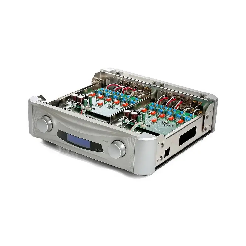 Важную роль в конструкции типа «двойное моно» Серии F играет фирменный счетверенный регулятор громкости (Quad Volume Control System - QVCS) , в котором используются четыре прецизионных резисторных сборки, синхронно переключаемые при вращении ручки громкости.Это обеспечивает великолепную ясность звучания, превосходное разделение каналов и чрезвычайно точные фазовые характеристики. Кроме того, за счет устранения на аудио плате всех проводов для регулятора громкости обеспечиваются кратчайшие пути сигналов, исключительно низкий уровень искажений и минимизируется деградация звука. Схема управления с ультра-низким уровнем шумов: все проводники с сигналами управления электрически отделены от основного блока предусилителя с помощью изолирующих элементов, встроенных в переднюю панель. Ручки регулировки с прецизионными подшипниками и таким же механизмом, как у компонентов Серии Grandioso. У Серии F ручки регулировки громкости и селектора вращаются исключительно плавно, давая «аналоговое» ощущение от работы. Не взирая на затраты, все они выфрезерованы из массива алюминия.