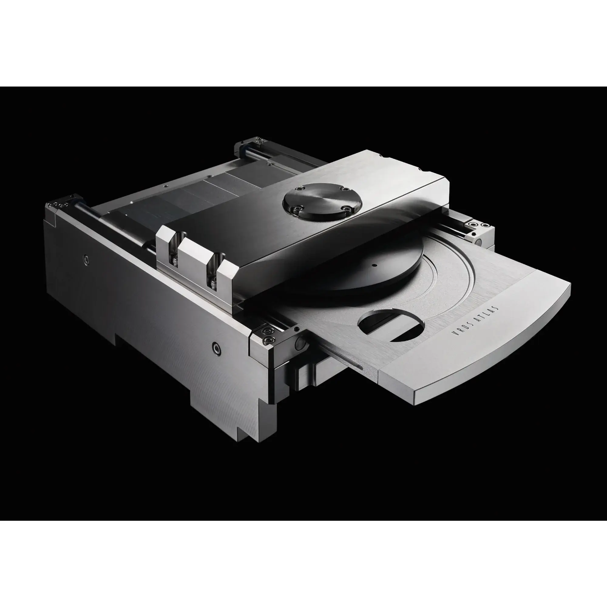 Новая платформа VRDS-ATLAS может похвастаться беспрецедентным механическим совершенством и превосходным качеством звука, благодаря тяжелой конструкции, которая на 127% тяжелее предыдущих версий (6,6 кг только для механизма и 13,5 кг вместе с основанием). Эта самая высокая жесткость и вес за всю историю механизмов VRDS позволяет значительно снизить любую вибрацию, которая может отрицательно сказаться на качестве звука. Новые боковые панели и мостик большего размера выполнены из стали SS400, а поворотный стол изготовлен из дюралюминия, который славится своим превосходным качеством звука. Кроме того, его шпиндель оснащен новой системой упорных подшипников, обеспечивающей одноточечную опору шпинделя без трения, которая обеспечивает плавное и бесшумное вращение поворотного стола.