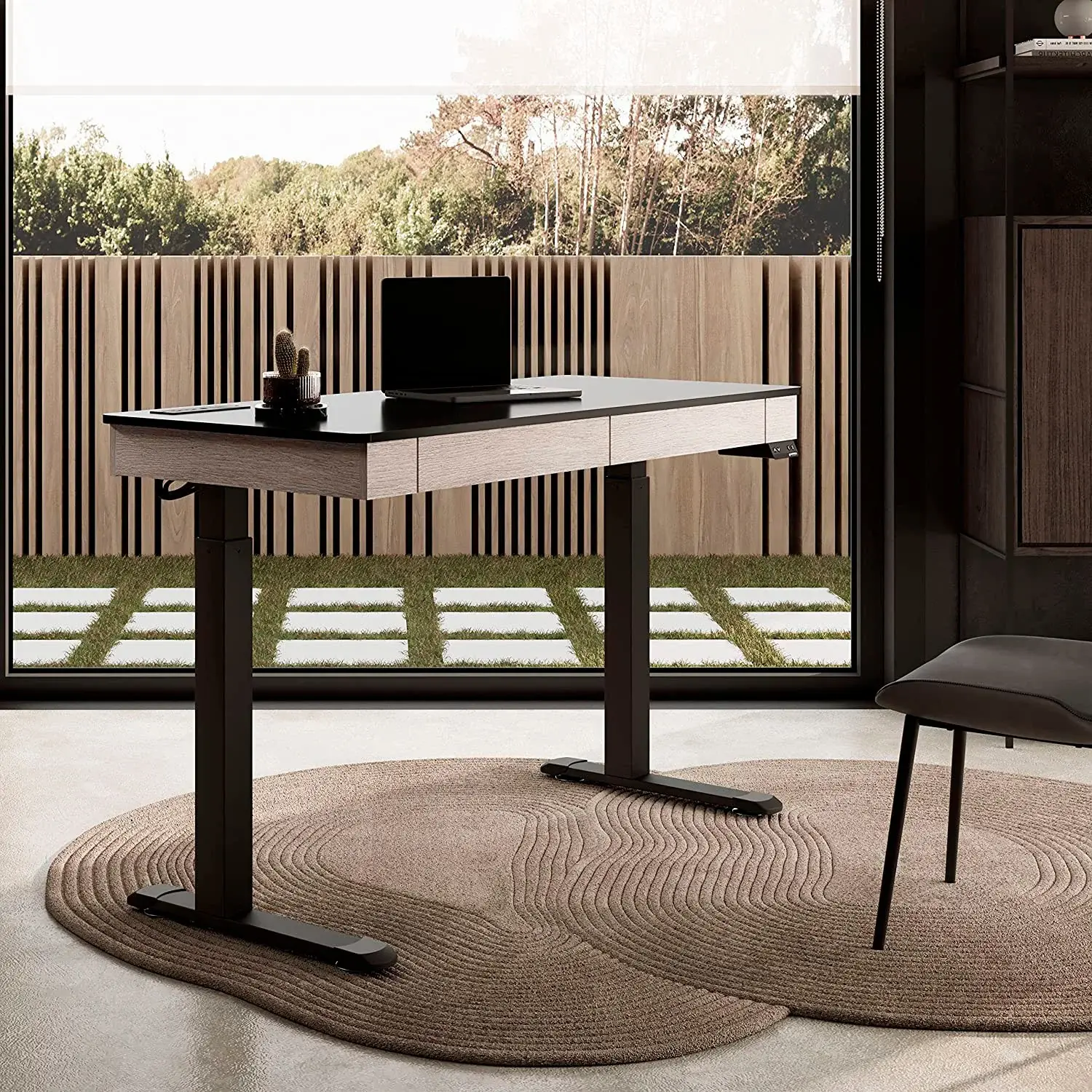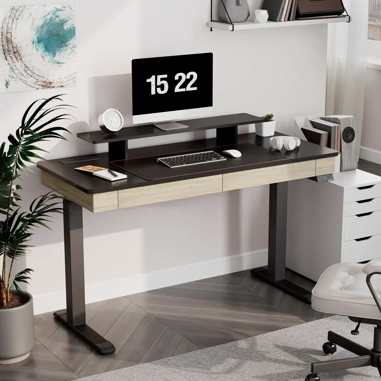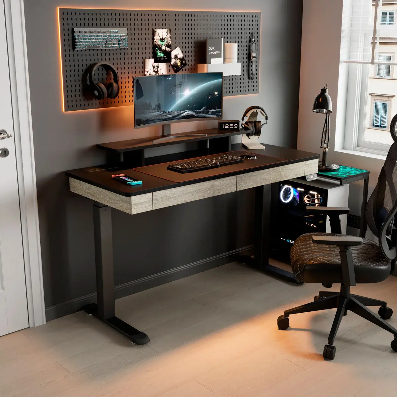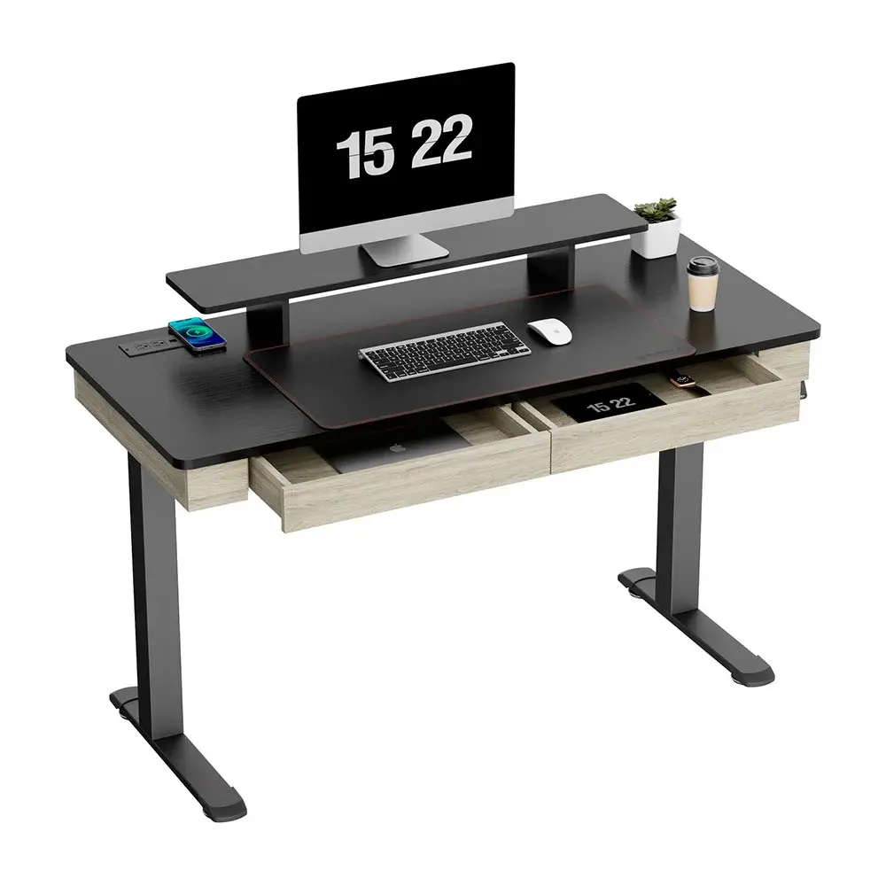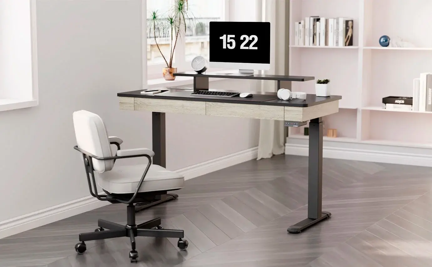 EUREKA ED-I55 — это прочный и устойчивый стол со стальной опорной рамой, в которую встроены электромоторы, что позволяет настраивать высоту столешницы простым нажатием кнопки на пульте управления. Также в стол встроены зарядная станция с беспроводной зарядкой, полка для монитора и два просторных выдвижных ящика. Благодаря специальной системе кабель-менеджмента, на поверхности стола никогда не будет беспорядка из проводов.