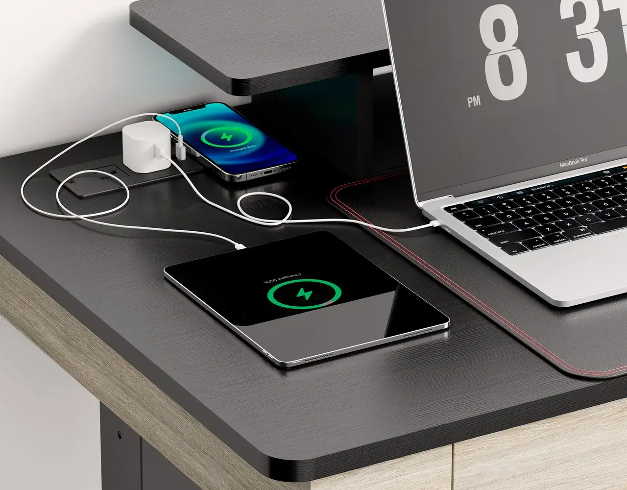 встроенная зарядная станция с беспроводной зарядкой, 4 USB-портами и 2 розетками;