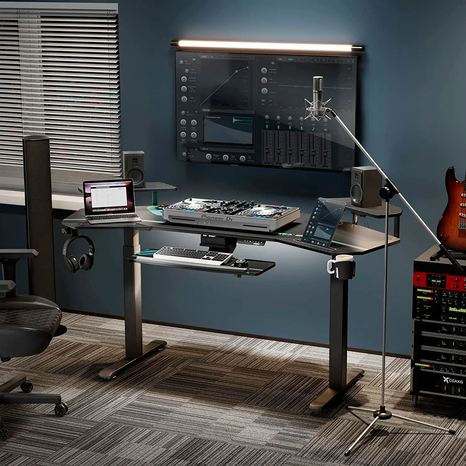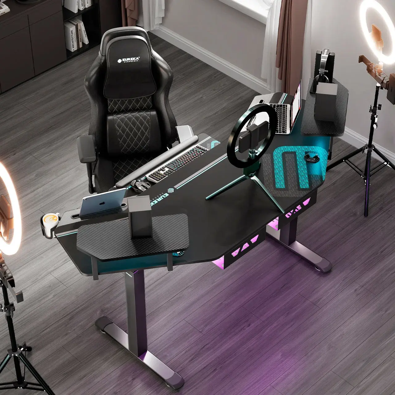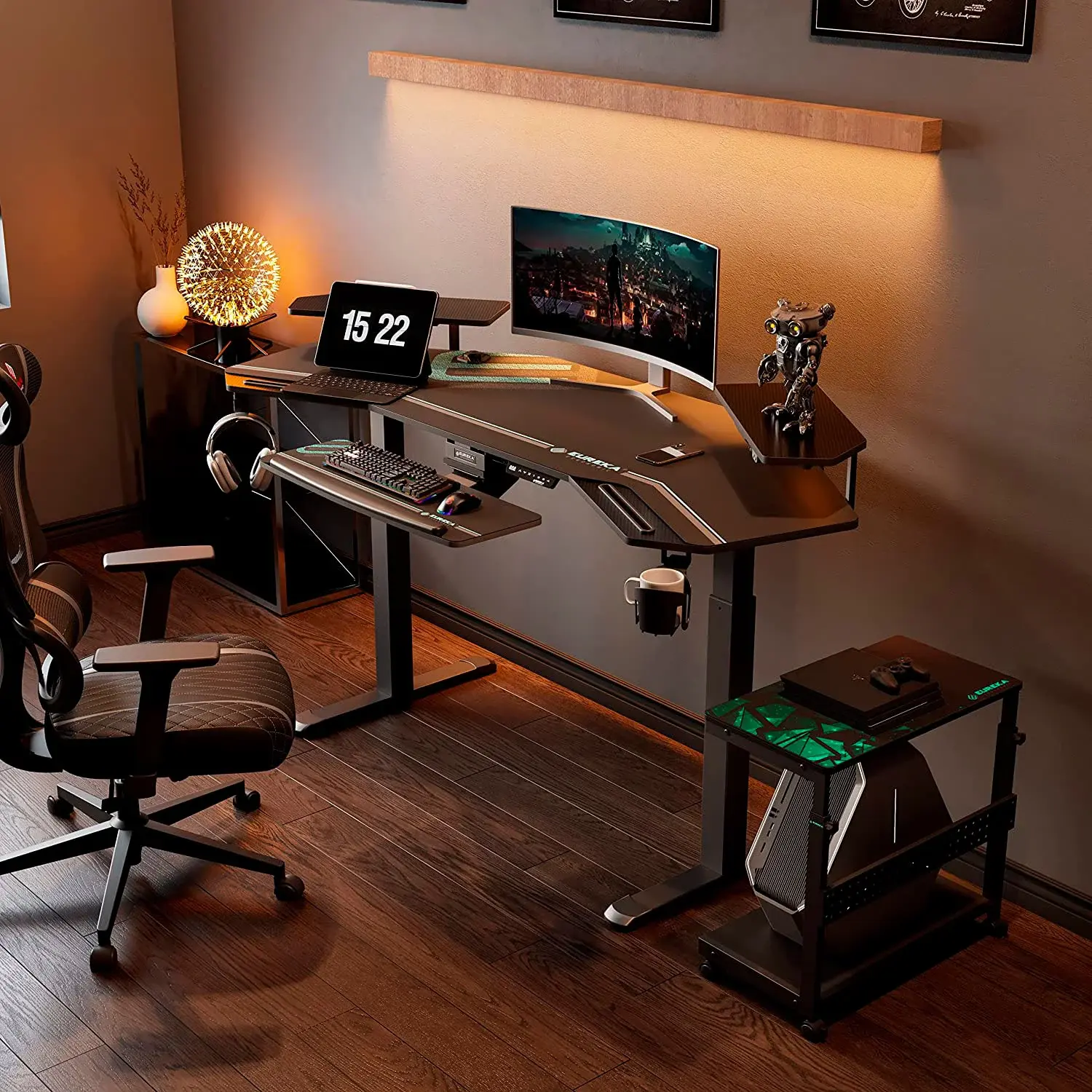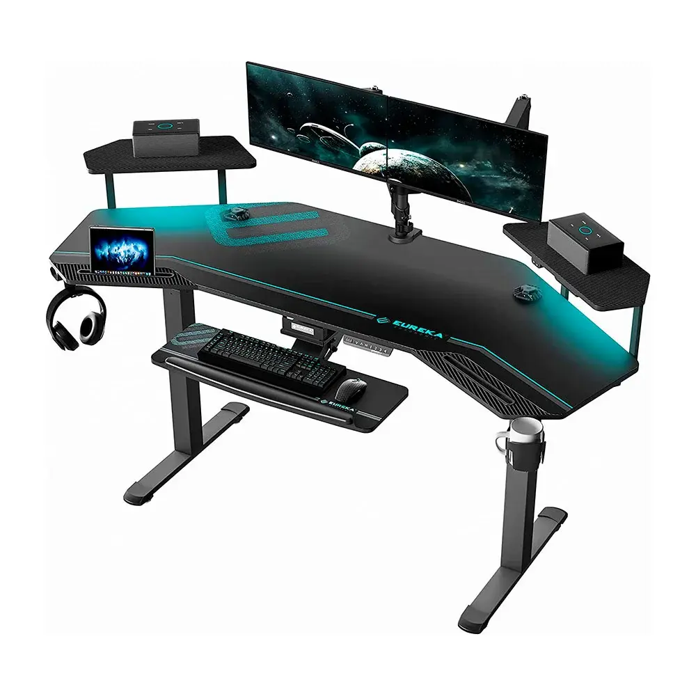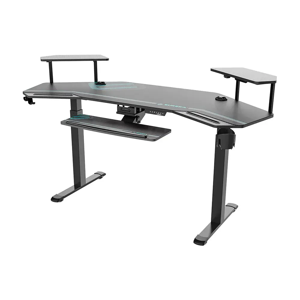 EUREKA ERK-ES71 Black — это прочный и устойчивый стол серии Aero 72 с рабочей поверхностью в форме крыла, стальной опорной рамой и покрытием, повторяющим текстуру углеволокна. В опоры встроены два электромотора, что позволяет настраивать высоту стола простым нажатием кнопки на пульте управления. Подставка для клавиатуры и две боковые полки помогут расположить комплектующие более эффективно. Благодаря специальной системе кабель-менеджмента, на поверхности стола никогда не будет беспорядка из проводов.