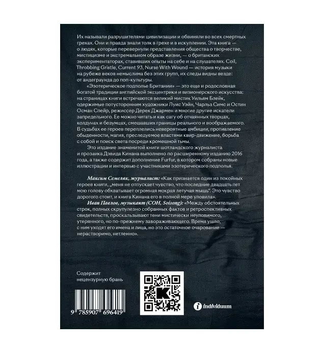 Их называли разрушителями цивилизации и обвиняли во всех смертных грехах. Они и правда знали толк в грехе и в искуплении. Эта книга — о людях, которые перевернули представления общества о творчестве, мистицизме и экстремальном образе жизни, — о британских экспериментаторах, ставивших опыты на себе и на слушателях. Coil, Throbbing Gristle, Current 93, Nurse With Wound — история музыки на рубеже веков немыслима без этих групп, их следы видны везде: от андеграунда до поп-культуры.