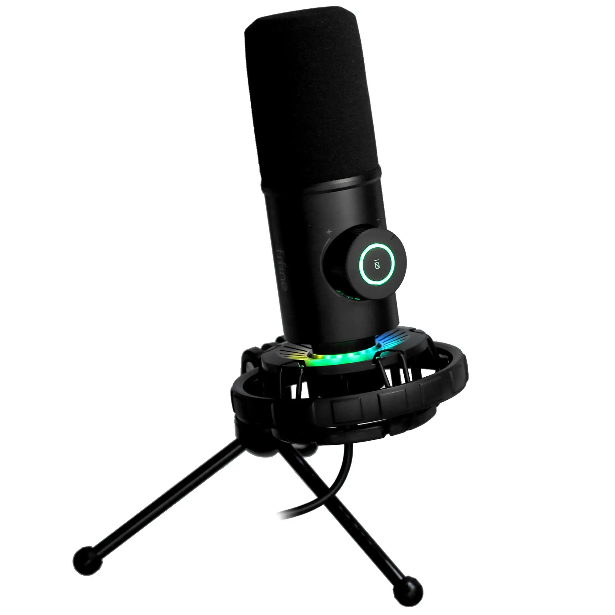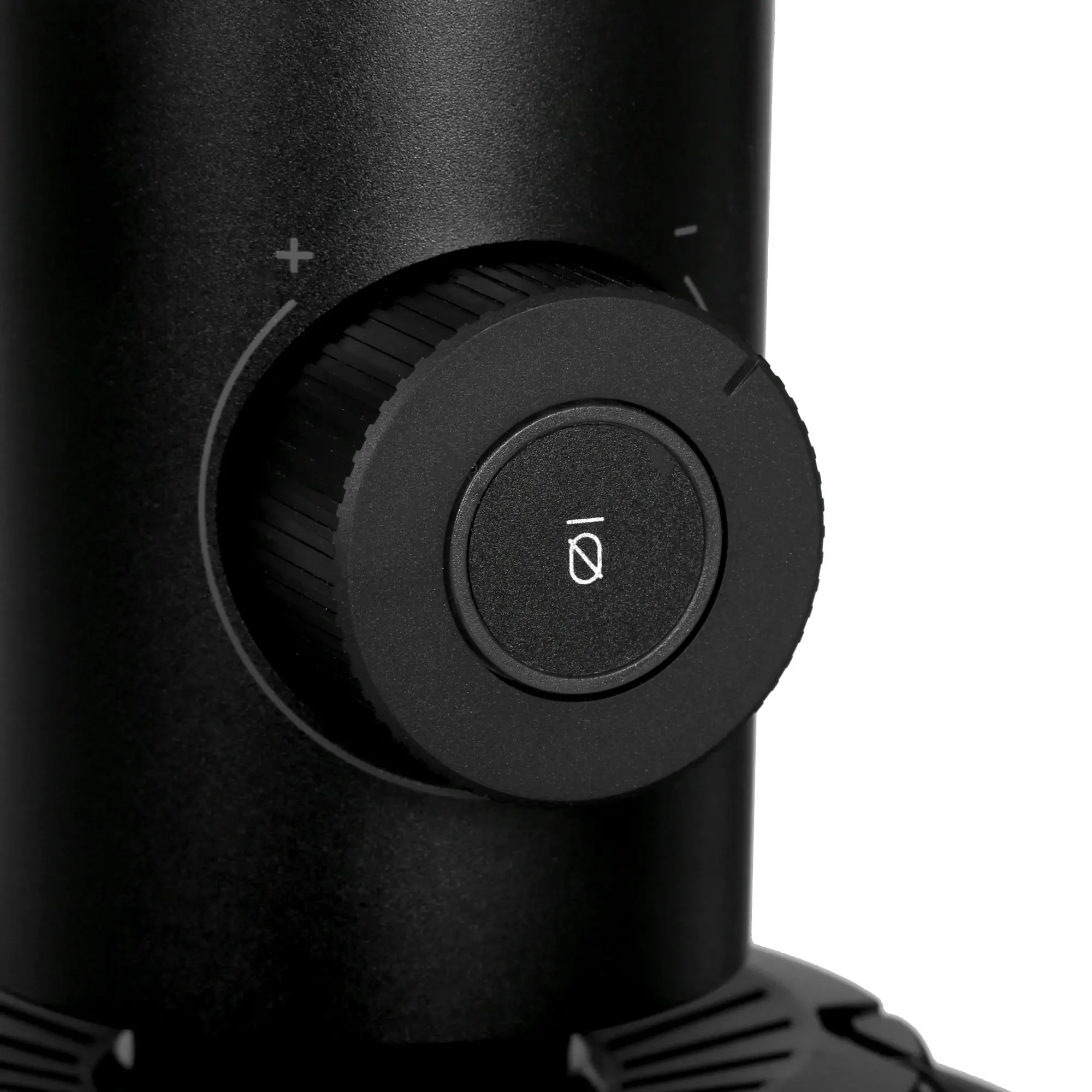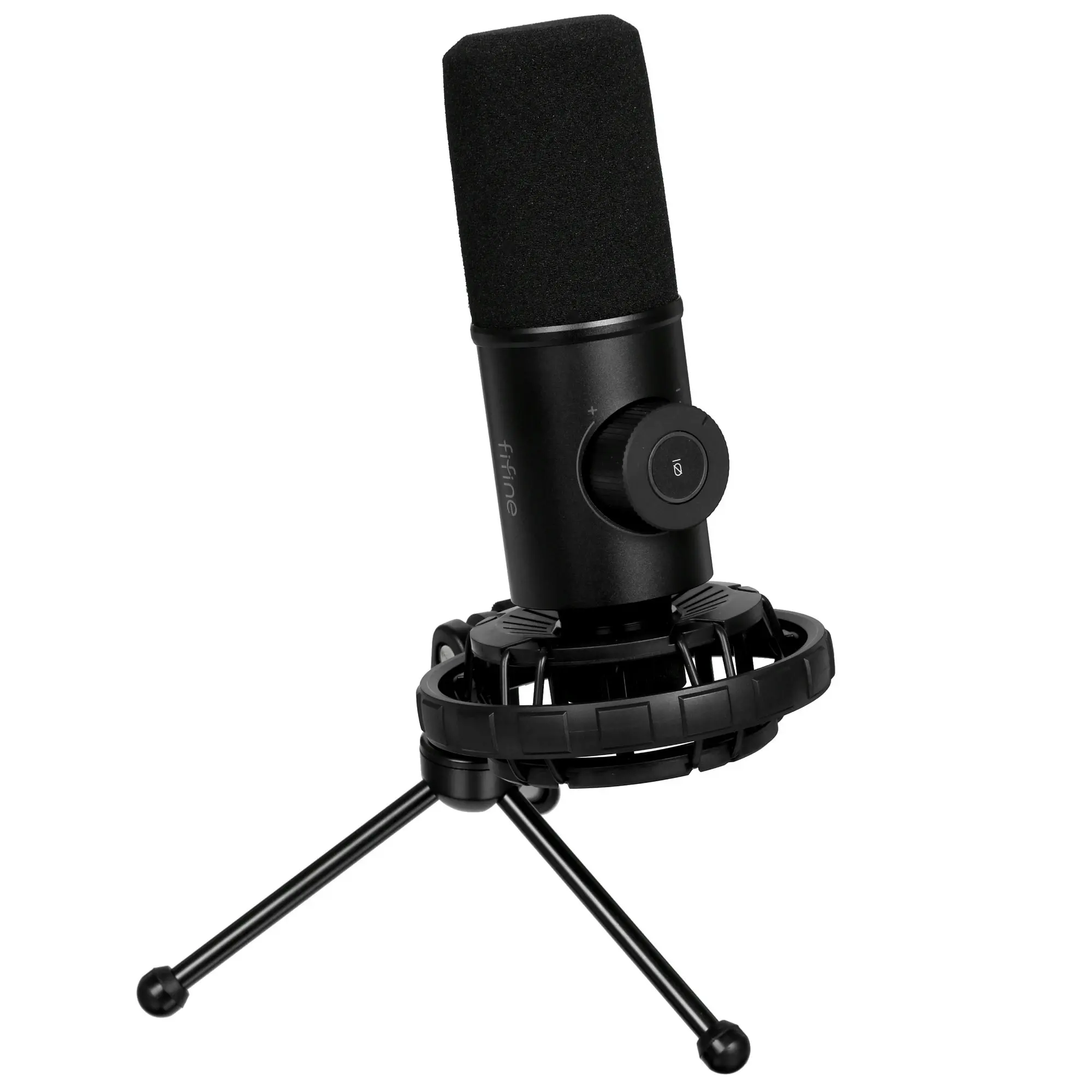 Микрофон Fifine K678 выполнен в эргономичном дизайне и может быть закреплен как на комплектной треноге, так и на микрофонной стойке, используя переходник 3/8 на 5/8. Он имеет универсальное подключение USB-A, а также встроенную звуковую карту, не требующих дополнительных настроек для начала работы. На корпусе модели расположен большой регулятор уровня записи, а также кнопка отключения и выход на наушники для мониторинга с низкой задержкой. RGB-подсветка в основании микрофона позволит создать уникальную атмосферу во время записи.