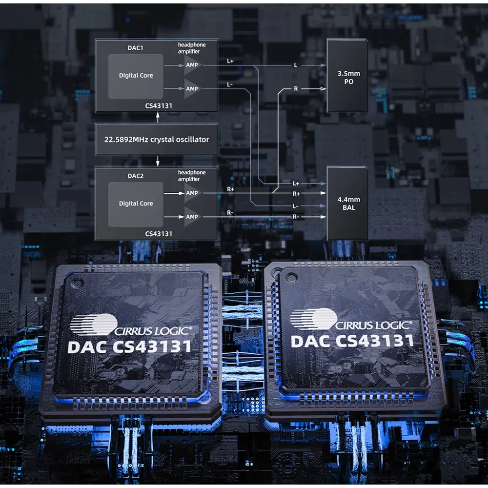 Каждый канал обрабатывается отдельно выделенным высококачественным ЦАП Cirrus Logic CS 43131. Это эффективно снижает перекрестные помехи и обеспечивает более высокое качество и чистоту звука.