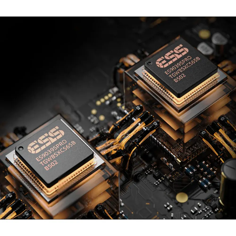 Цифро-аналоговое преобразование поручено двум 8-канальным чипам ES9039SPro последнего поколения от ESS Sabre Technologies. Эти 32-битные микросхемы ЦАП используют архитектуру HyperStream 4-го поколения и обещают высочайший уровень производительности с низким уровнем искажений и широким динамическим диапазоном.