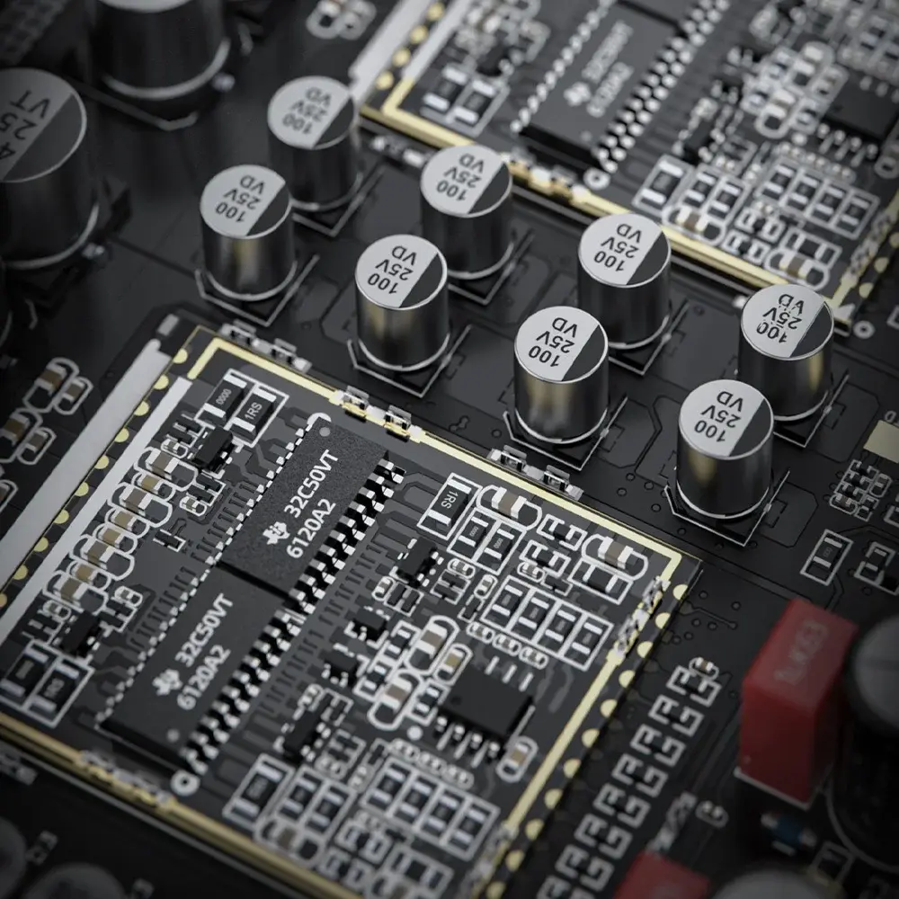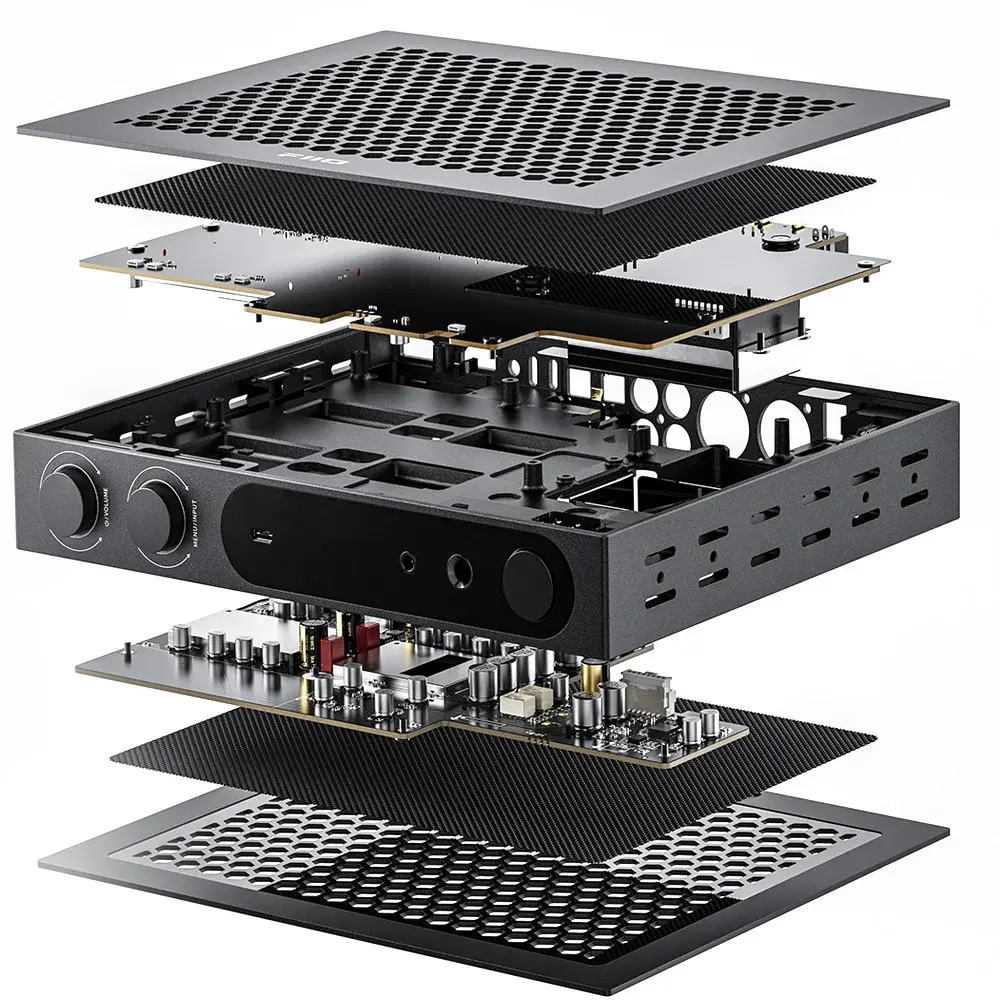 Цифровые и аналоговые аудиосхемы K19 расположены на отдельных платах для полной изоляции и значительного снижения помех. Плата сигнального процессора DSP, плата ЦАП и плата усилителя для наушников THX оснащены металлическими экранами, благодаря тому, что цифровая плата и модульная плата имеют изолированную конструкцию из алюминиевого сплава. Все эти меры помогают свести к минимуму перекрестные помехи и обеспечить чистоту сигнала. Кроме того, корпус из алюминиевого сплава с ячеистой структурой также помогает снизить внешние помехи, позволяя вам наслаждаться чистой музыкой.