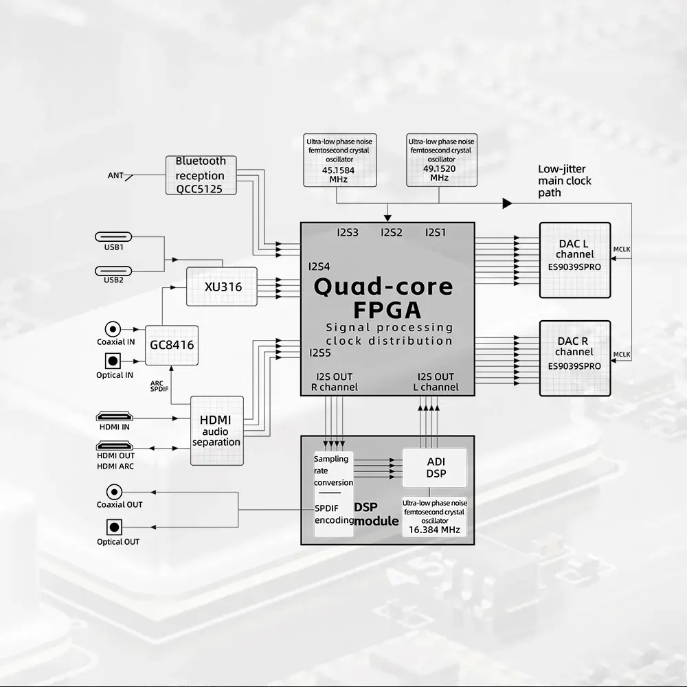 FiiO K19 отличается передовыми возможностями обработки сигнала, которые основаны на использовании аудиокомпонентов высокого класса. Центральное место в его исключительной производительности занимают два 8-канальных ЦАП ESS ES9039SPRO производства ESS Technology Inc., известные своей точностью преобразования цифровых аудиосигналов в аналоговые. Эти ЦАПы работают в паре с двумя тактовыми генераторами AccuSilicon AS318-B, обеспечивая безупречно точный тактовый сигнал для превосходного качества звука. Такая комбинация позволяет FiiO K19 обрабатывать PCM-аудиосигнал до 32 бит и 768 кГц, а также DSD-аудиосигнал до DSD512, в соответствии со спецификациями производителя.