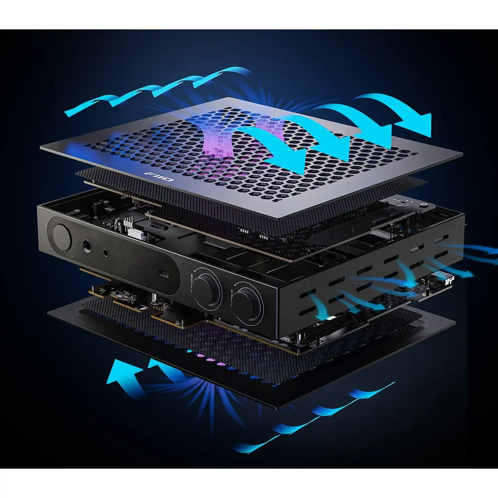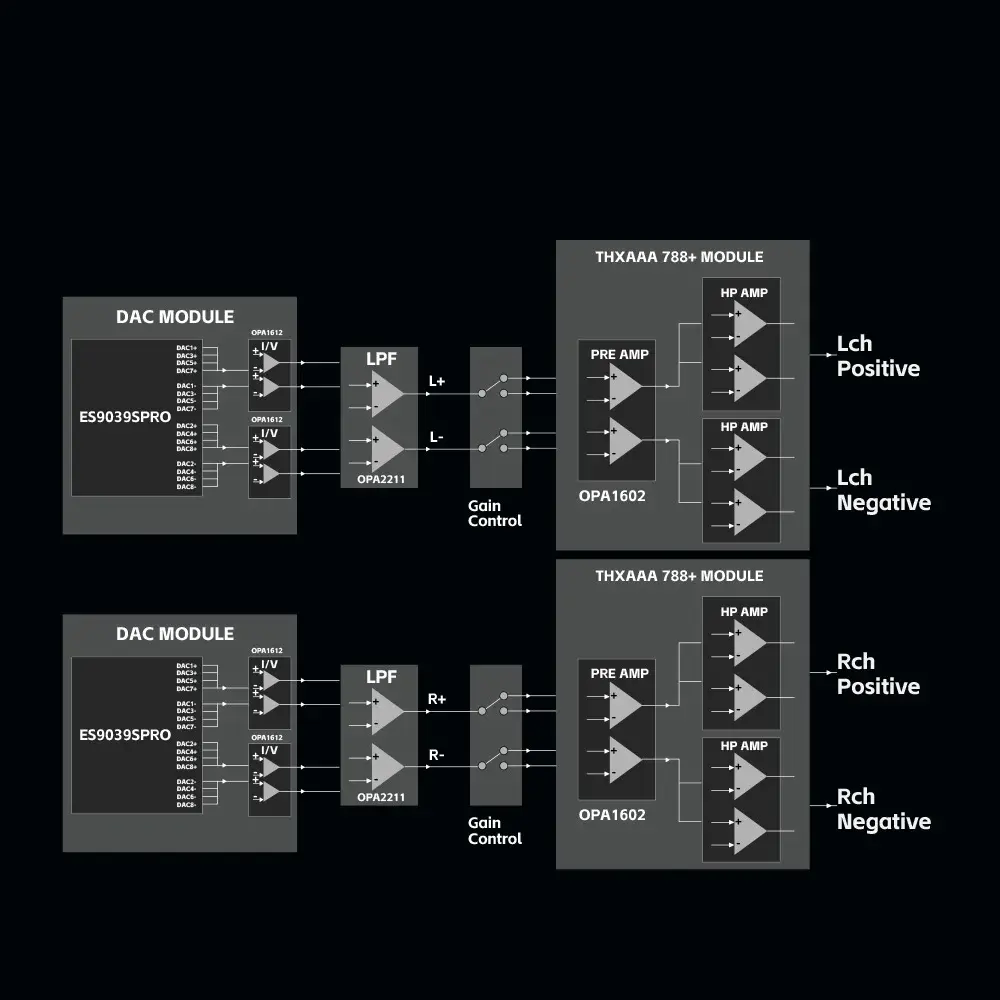 Усиление в FiiO K19 реализовано на 8-канальном чипсете THX AAA 88+. Каналы усилителей THX включены параллельно, реализуя полностью балансное 4-канальное усиление. Выходная мощность новинки достигает 8 Вт на канал, что достаточно для раскачки даже самых требовательных к усилению наушников, благодаря чему FiiO K19 может с легкостью использовать любые наушники и сохранять полный контроль над аудиосигналом. Такой тщательный подбор компонентов подчеркивает способность FiiO K19 обеспечивать непревзойденные впечатления от прослушивания, удовлетворяя запросы как аудиофилов, так и профессионалов. Микросхемы усилителя THX соединены параллельно группами 2×2, образуя полностью сбалансированную 4-канальную систему усиления. В результате улучшаются переходные процессы и повышается выходная мощность до 8000 МВт+8000 МВт при нагрузке 32 Ом, что позволяет K19 с легкостью использовать все виды наушников.