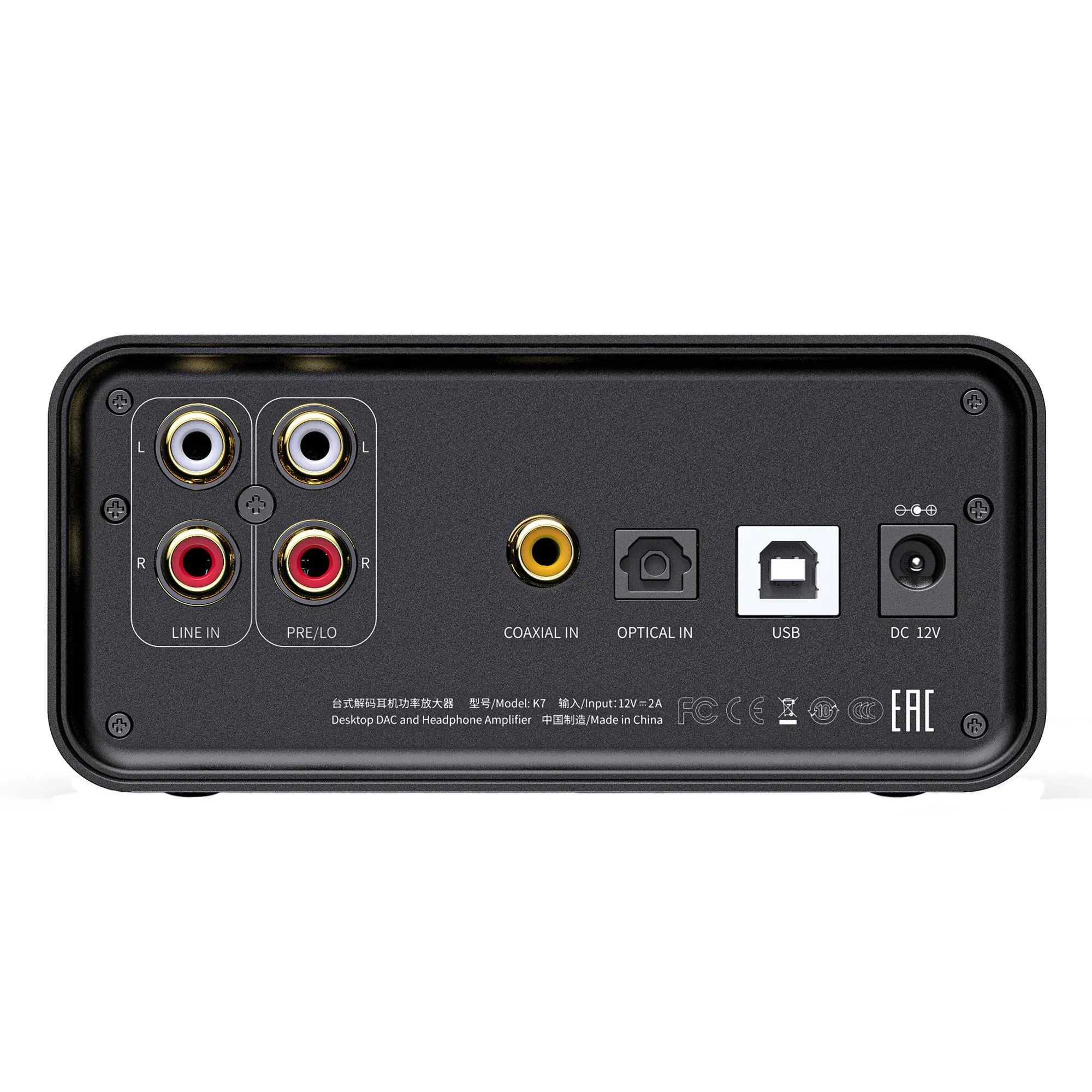 FiiO K7 - усилитель для наушников со встроенным цифро-аналоговым преобразователем. Устройство имеет полностью симметричную шестиступенчатую звуковую схему, сводя к минимуму перекрёстные помехи. Благодаря использованным усилителям THX AAA 788+, K7 выдаёт 0,56 Вт на нагрузку 300 Ом и 2 Вт на нагрузку 32 Ом с искажениями 1%.