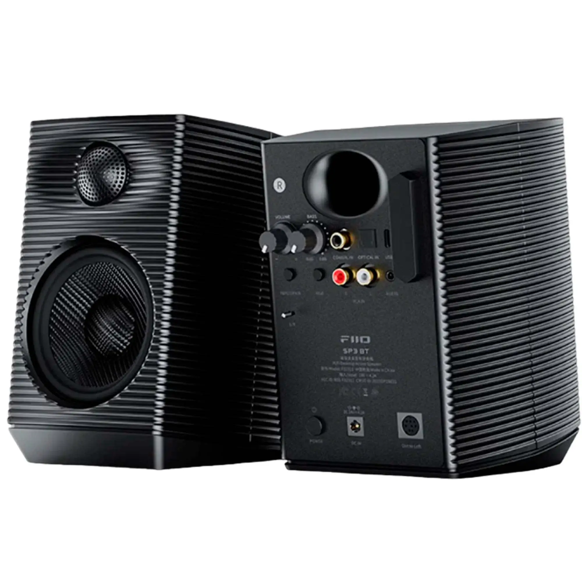 FiiO SP3 BT — это компактная активная полочная акустическая система с Bluetooth на чипе Qualcomm QCC5124, с поддержкой кодеков высокого разрешения LDAC (до 990 Кбит/с)/aptX Adaptive/AAC. Особенности: частотный диапазон 65 Гц – 20000 Гц; максимальная мощность: 2x40 Вт; Bluetooth 5.0 на чипе Qualcomm QCC5124; 25 мм твитер с шелковым куполом, 88.9 мм СЧ-динамик из углеродного волокна; поддерживаемые кодеки: LDAC, aptX Adaptive, aptX HD, aptX LL, aptX, AAC, SBC; интерфейсы: RCA, AUX, коаксикальный, оптический, USB Type C. Модель представляет собой компактную (163x120x132 мм) двухполосную акустическую систему, объем алюминиевого корпуса 2.35 л, разделение полос (частота раздела 3,4 кГц) обеспечивает цифровой DSP. Используются динамики: дюймовый ВЧ с шелковым куполом и 3.5″ НЧ/СЧ динамик с диффузором из карбона. Эти большие НЧ-динамики имеют неотъемлемое преимущество перед меньшими НЧ-драйверами в динамике, проецировании более широкой звуковой сцены и других звуковых атрибутах. При просмотре фильмов или прослушивании музыки этот НЧ-динамик действительно способен передать грандиозность звучания даже на больших громкостях. Акустическое оформление — фазоинвертор (его порт изогнут внутри корпуса). Углеродное волокно обладает высокой прочностью и жесткостью, но при этом имеет небольшой вес - идеальные свойства для динамика. Малый вес углеволокна позволяет НЧ-динамику иметь быстрый переходный отклик, а высокая прочность и жесткость углеволокна уменьшают нелинейные искажения, сводя к минимуму нежелательные вторичные колебания при движении динамика во время воспроизведения звука. В целом, материал НЧ-динамика из углеродного волокна способствует точному воспроизведению звука и позволяет лучше погрузиться в прослушивание. ВЧ-динамик расположен под точным углом, что позволяет практически без потерь передавать звуковые волны слушателям, находящимся вне оси в диапазоне от 0 до ±15°. Кроме того, специальный рисунок перед твитером разработан таким образом, чтобы звуковые волны, исходящие от твитера, более эффективно распространялись по помещению, значительно улучшая воспринимаемый звуковой ландшафт и создавая иллюзию присутствия в большом концертном зале. Встроенный сдвоенный усилитель класса D (3118 от Texas Instruments) обеспечивает 30 Вт усиления для НЧ канала и 10 Вт на ВЧ. Благодаря чипу Qualcomm QCC5124 Bluetooth SP3 BT поддерживает несколько Bluetooth-кодеков высокого разрешения, таких как LDAC/aptX Adaptive/AAC, предоставляя вам свободу и гибкость в выборе способа прослушивания. При использовании LDAC вы можете прослушивать аудио с высоким битрейтом до 990 кб/с, что позволит вам услышать каждую деталь в вашей музыке. FIIO SP3 BT не только обеспечивает высококачественную платформу для беспроводной передачи данных, но и поддерживает проводные цифровые порты, включая Type-C/COAX/OPTICAL. Благодаря этим цифровым каналам высокой четкости без потерь вы можете полностью раскрыть потенциал FiiO SP3 BT. SP3 BT был разработан для полноценной работы с мобильными приложениями FIIO Control APP/FIIO Music. При подключении по Bluetooth мобильные приложения позволяют выполнить тонкую настройку звука, например, настроить имя устройства и указать, какие кодеки Bluetooth вы хотите использовать. Но главная изюминка приложения - 10-полосный параметрический эквалайзер, позволяющий для каждой полосы регулировать значение усиления и другие параметры. У колонок есть автоматический переход в режим ожидания при 20 минутах бе