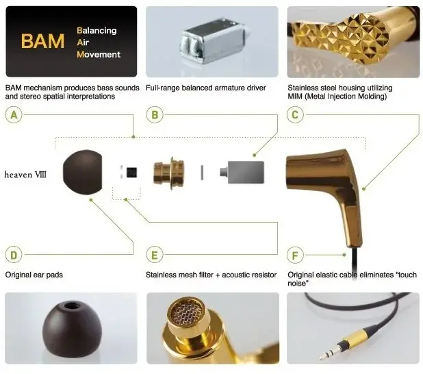 Final Audio Design Heaven VIII представляют собой вставные наушники референсного класса от всемирно известной компании Final Audio Design. Модель получила отличные характеристики и дорогой дизайн, потому с этими наушниками не хочется расставаться ни на секунду. Разнообразные технологии, использованные в наушниках, позволят насладиться музыкой в деталях. Безупречный звук Арматурный драйвер наушников обеспечивает высококлассное звучание, без каких-либо помех и резонансов. Объем глубина и чистота звука не оставят равнодушными даже самых требовательных любителей музыки. Реалистичность воспроизведения в этой модели завораживает. Первоклассный дизайн Final Audio Design Heaven VIII обладают роскошным дизайном, который ни чуть не уступает красоте ювелирных украшений. Для получения такой красоты наушников было использовано покрытие 24К золота и специально разработанная технология Metal Injection Molding. В основе этой технологии лежит процесс плавления мельчайшего порошка стали, для идеально гладкой формы наушника. Удобство в использовании Наушники получили разъем 3.5 мм, благодаря чему их можно использовать с большинством портативных устройств. Позолоченный штекер позволяет улучшить проводимость. Для удобства в комплекте поставляется стильный металлический кейс для транспортировки наушников. Особенности Безупречное качество звука Золотое покрытие 24К Хромированный кейс в виде портсигара Сменные амбушюры Мощный арматурный драйвер Плоский кабель Комплектация Наушники Сменные амбушюры Кейс для переноски Руководство пользователя