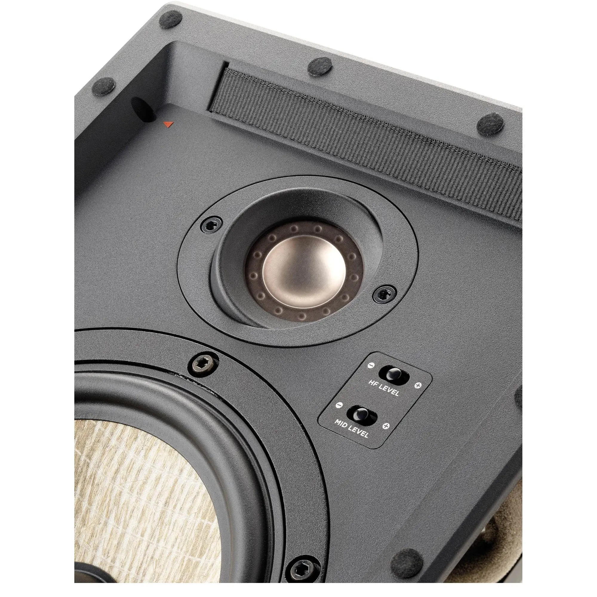 Твитеры TNV2 колонок Focal 300 IW 6 уже использовались в линейках Chorus и Easya. В этой модели используется эксклюзивная технология компании Focal — вогнутый купол, обеспечивающий оптимальную передачу энергии и ограниченную направленность. Купол из алюминиево-магниевого сплава гарантирует наличие уникальных характеристик в плане прочности, смягчения высоких частот для получения мягкого и энергичного звучания. Шелковистый звук улучшается еще и благодаря подвесу из микропористого ПВХ, поддерживающему купол. Для твитера колонки Focal 300 IW 6 предусмотрены 3 регулируемых положения (−3 дБ, 0 дБ, +3 дБ), обеспечивающие настройку уровня высоких частот звуков в зоне прослушивания. Твитер также можно устанавливать с наклоном (±20°) и поворачивать его на 360°. Вы можете направлять твитер на зону прослушивания для увеличения точности воспроизведения высоких частот и стереофоничности звукового образа. Эти две настройки обеспечивают контроль над внеосевыми частотными характеристиками колонки.