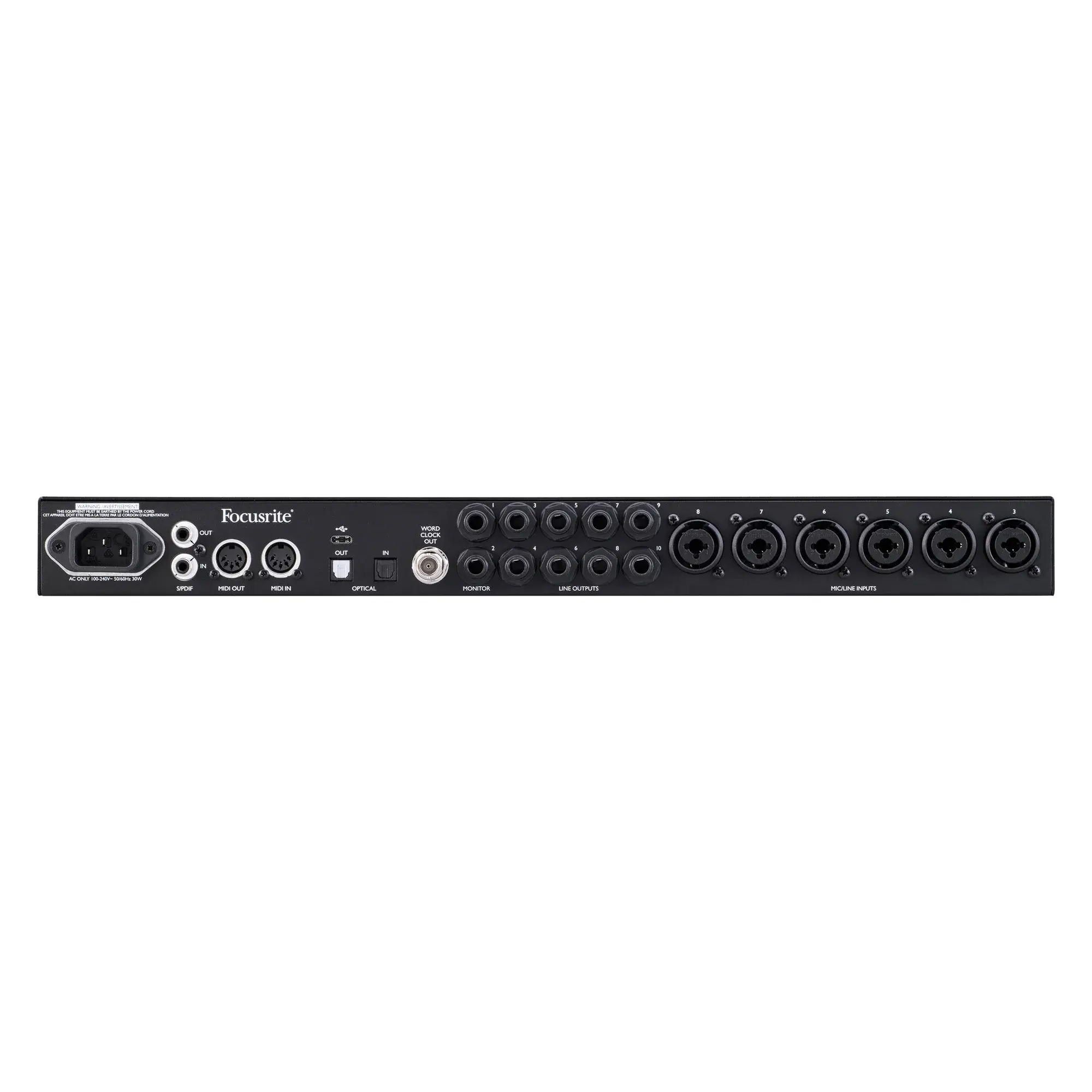 Помимо этого, звуковая карта имеет невероятно низкую задержку - всего 1,38 мс, что позволяет использовать эффекты для мониторного выхода в режиме реального времени. Передняя панель снабжена рядом контрольных индикаторов и ручками контроля уровня наушников. Помимо микрофонных и линейных входов/выходов, предусмотрен выход для Worldclock, MIDI i/o, S/PDIF i/o, а также цифровой вход ADAT. Удаленный контроль над звуковой картой возможен при помощи приложения для устройств iOS Focusrite iOS Control. Для работы с компьютера в комплекте с аудиоинтерфейсом поставляется Focusrite Control, предназначенный для легкой настройки мониторинга и маршрутизации. Также в комплект входят Red 2 и Red 3 AAX, AU и VST Plug-in Suite, моделирующие фирменные эквалайзер и компрессор.