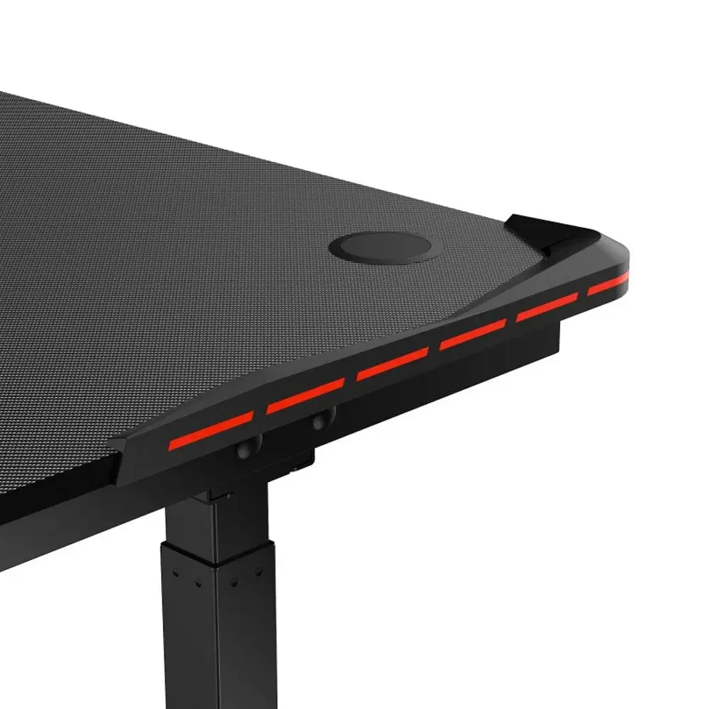 Столешница выполнена из МДФ с элементами пластика, отличается повышенной прочностью и влагостойкостью. Основа стола выполнена из надежного алюминия. В столе предусмотрен кабель-менеджмент. Аккуратно уложенные провода не портят внешним видом интерьер помещения. Конструкция выполнена полностью в черном цвете. Стол оснащен RGB-подсветкой, создающей игровую атмосферу.