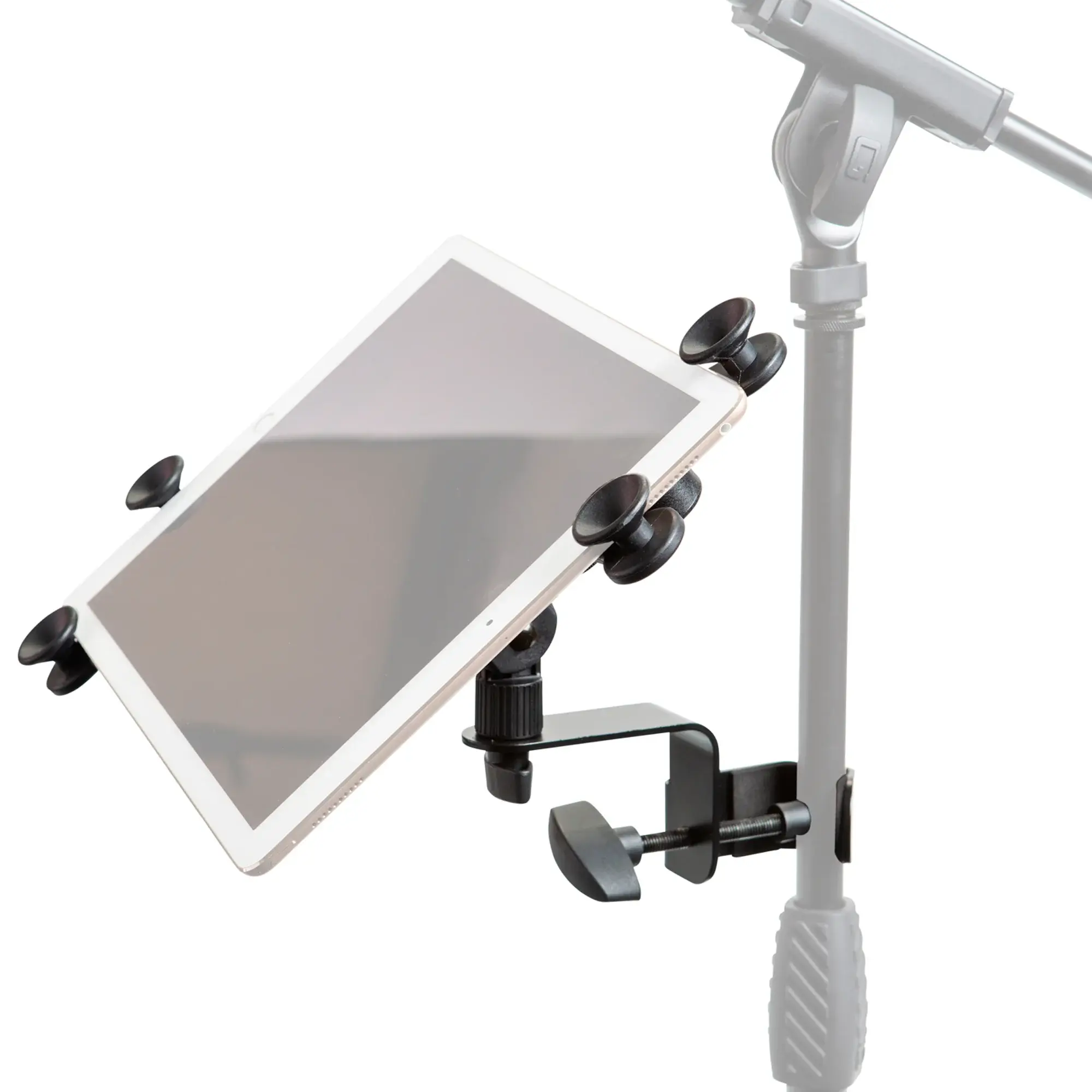 Gator Universal Tablet Clamping Mount — это простое и прочное решение для крепления различных планшетов и смартфонов к микрофонным стойкам, пюпитрам для нот, акустических систем, барабанному оборудованию и другим стойкам. Идеально подходит для любых целей: от живых выступлений и репетиций до студийных сессий и профессиональных презентаций. Просто закрепите держатель непосредственно на стандартной резьбе микрофонной стойки или закрепите его на любой трубке стойки диаметром до 38 мм. Мягкие сенсорные ручки позволяют легко регулировать и фиксировать угол наклона устройства и ориентацию экрана (книжную или альбомную). Угловые захваты регулируются под экраны размером от 152 мм до 381 мм. Комплектация: держатель; документация.
