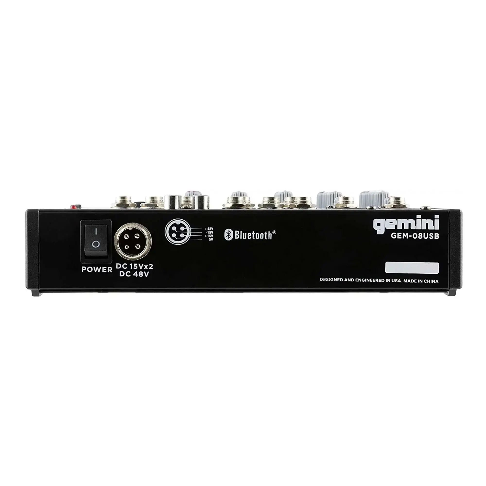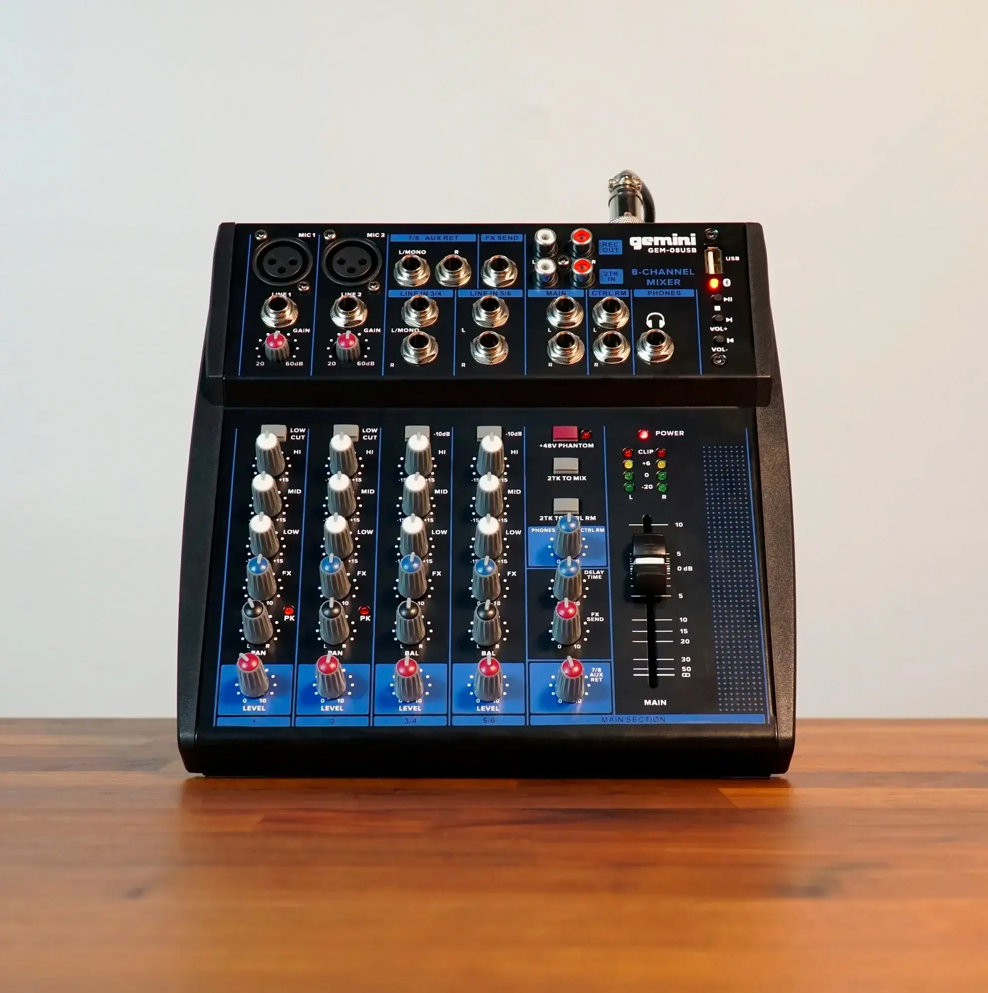 GEM-08USB - это профессиональный микшер, имеющий небольшой вес и размер подходящий для того чтобы брать его с собой. Оснащен 8 каналами, удобным интерфейсом управления и настройки звука, а также возможностью воспроизведения через USB и потоковой передачей по Bluetooth.