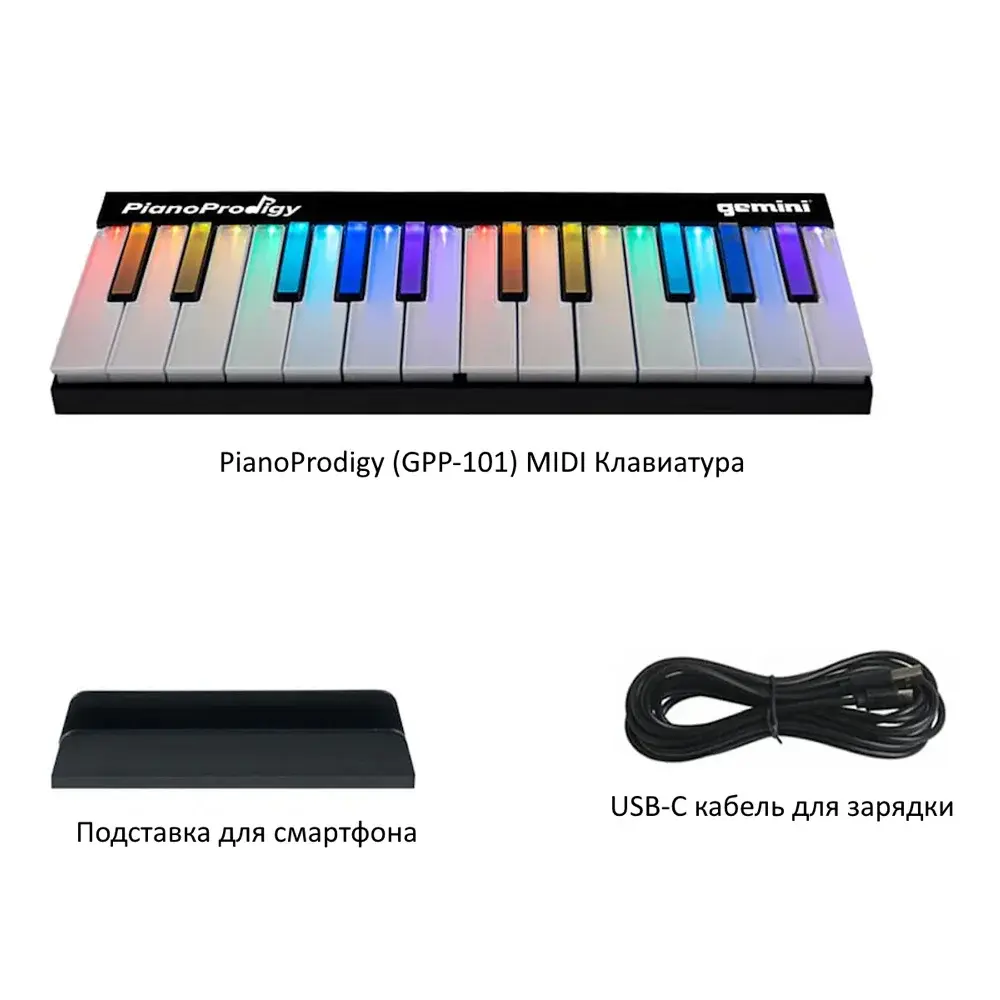 Gemini GPP-101 PianoProdigy - беспроводная обучающая MIDI-клавиатура с 24 клавишами и подсветкой. Яркие клавиши с подсветкой делают обучение увлекательным и интуитивно понятным, что идеально подходит для музыкантов любого уровня.