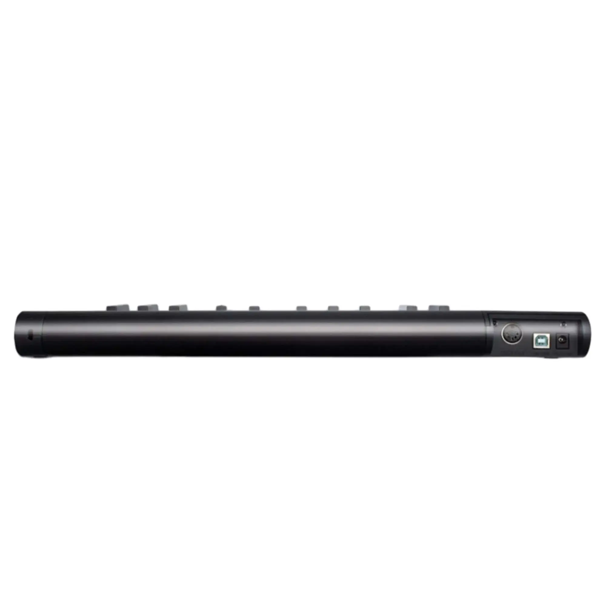 В наличии есть 25 уменьшенных клавиш, оснащенных чувствительностью к силе нажатия. Такой формат клавиш будет удобен для работы с виртуальными музыкальными инструментами типа Lead или Bass, аппликатура которых проста и обычно состоит из последовательности отдельных нот, а не больших аккордов. Для управления функционалом есть пять кнопок: они отвечают за смену октав, транспортирование, включение режима арпеджиатора и за функцию сустейна. Наконец, здесь есть джойстик, который одновременно отвечает за высоту тона и глубину модуляции, но может быть назначен и на любые другие параметры.