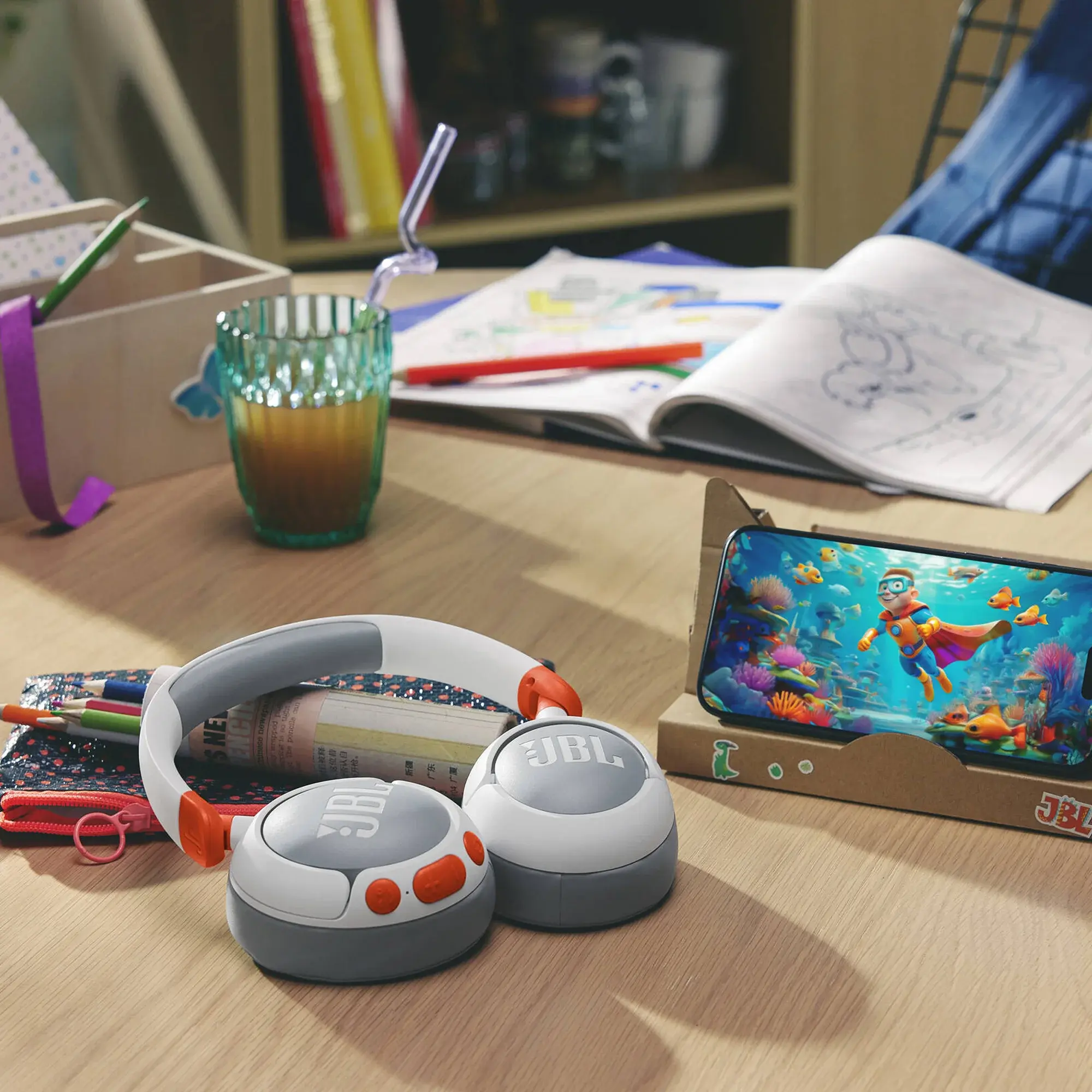 Упаковка без пластика складывается в подставку для устройства, а также в комплекте есть наборы ярких наклеек JBL, чтобы дети могли персонализировать свои наушники.