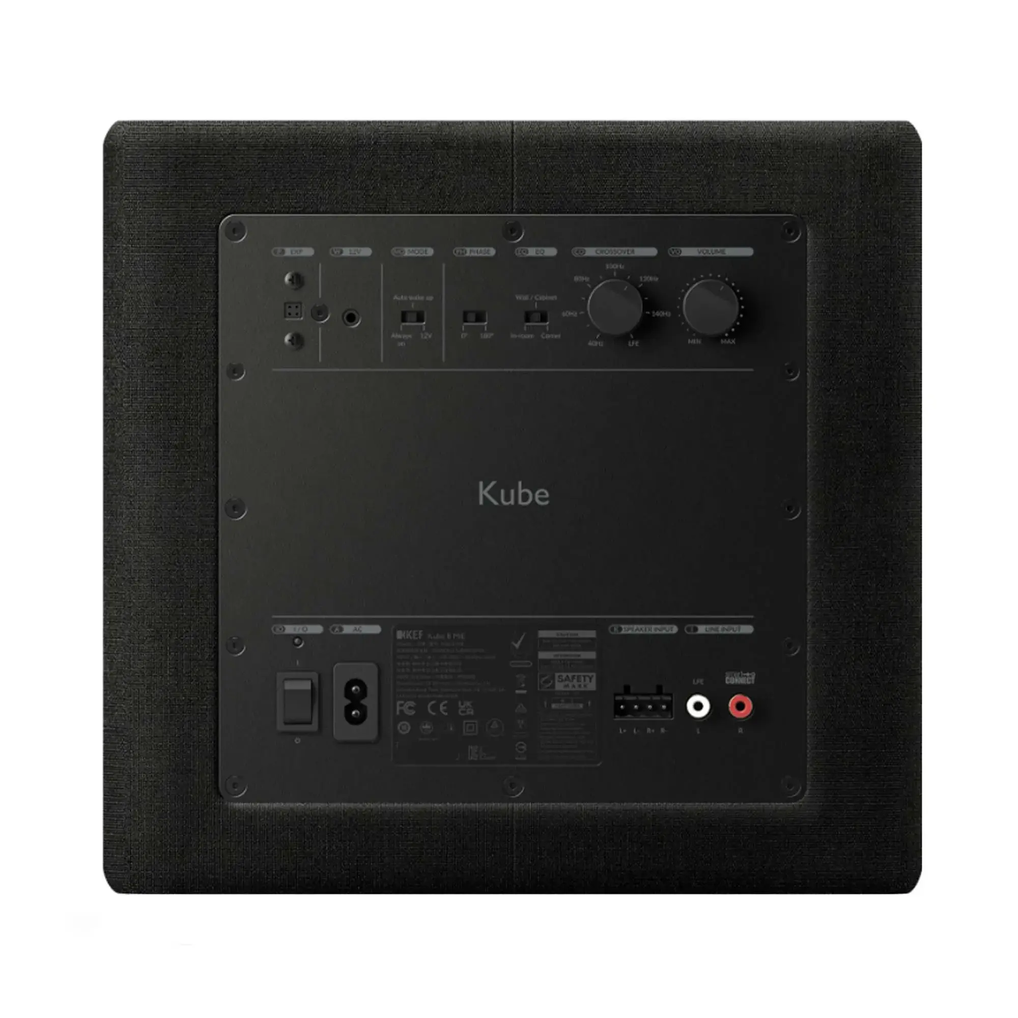 На задней панели KEF Kube 8 MIE находится панель с входными гнездами и органами управления. Сабвуфер оснащен регуляторами уровня сигнала и частоты настройки входного фильтра (в диапазоне от 40 до 140 Гц). При желании фильтр можно отключить, поставив регулятор в положение LFE для подключения к сабвуферному выходу AV-ресивера или многоканального процессора. Также здесь имеется переключатель абсолютной фазы сигнала 0 — 180 градусов.