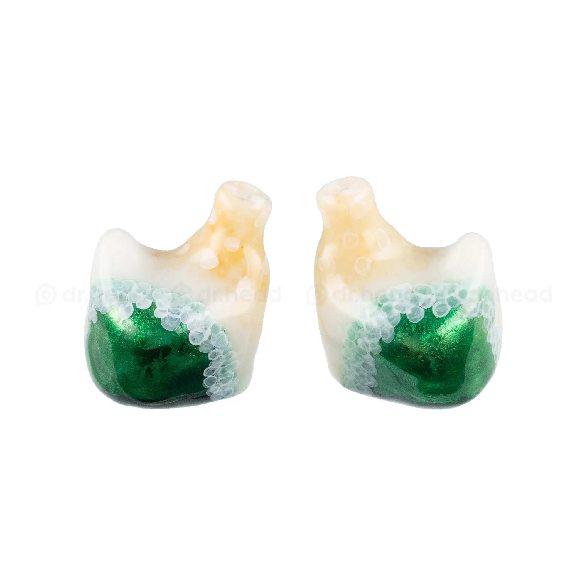 Корпуса наушников привычно уже, раскрашены вручную профессиональным художником. За основу взяты белый и зеленый цвет, с элементами текстуры камня и не на что непохожими абстрактными пейзажами. На каждом наушники красуются золотые надписи Kinera и URD.