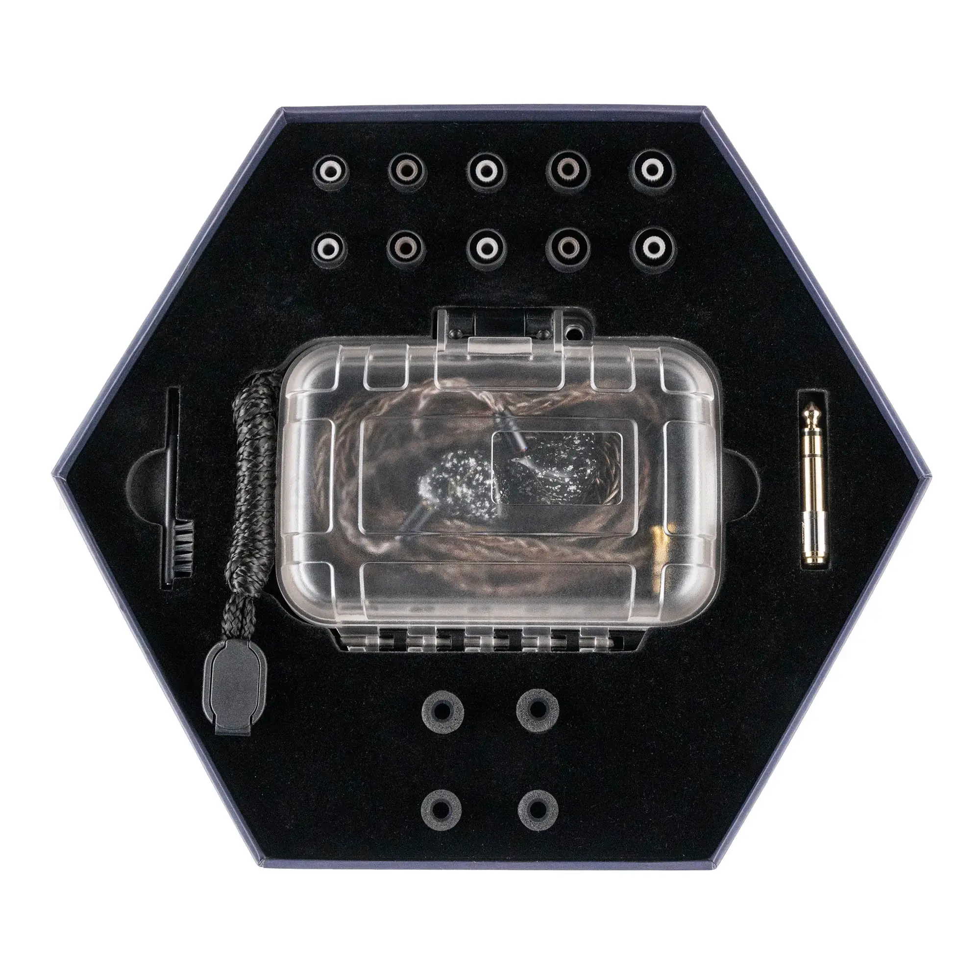 Odin поставляются в красивой шестиугольной упаковке с набором аксессуаров. Помимо наушников и кабеля в комплект входит 5 пар силиконовых насадок FAD E-type и 2 пары поролоновых. Kinera уделяет большое внимание аксессуарам. Ушные насадки типа FADE популярны благодаря своему качеству, и они действительно хорошо сочетаются с Odin с точки зрения звучания. Это гарантирует хороший отклик на басах и хорошее общее звучание. Форма насадок обеспечивает удобную посадку, которая не будет слишком беспокоить вас при длительном прослушивании.