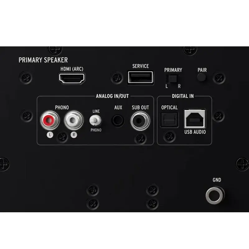 Корпус имеет встроенный в его тыльную часть порт фазоинвертора с выходной трубой в форме рупора Tractrix. Доступны два вида отделки (натуральный ореховый шпон или матово-черная поверхность). В верхнюю панель активной АС интегрированы два миниатюрных металлических «колеса» для настройки уровня громкости и выбора источника. В тыльную панель активной колонки встроена панель с набором коммутирующих разъемов, среди которых следует выделить порт HDMI с поддержкой возвратного канала ARC, который является идеальным вариантом для подключения к ТВ-панели.