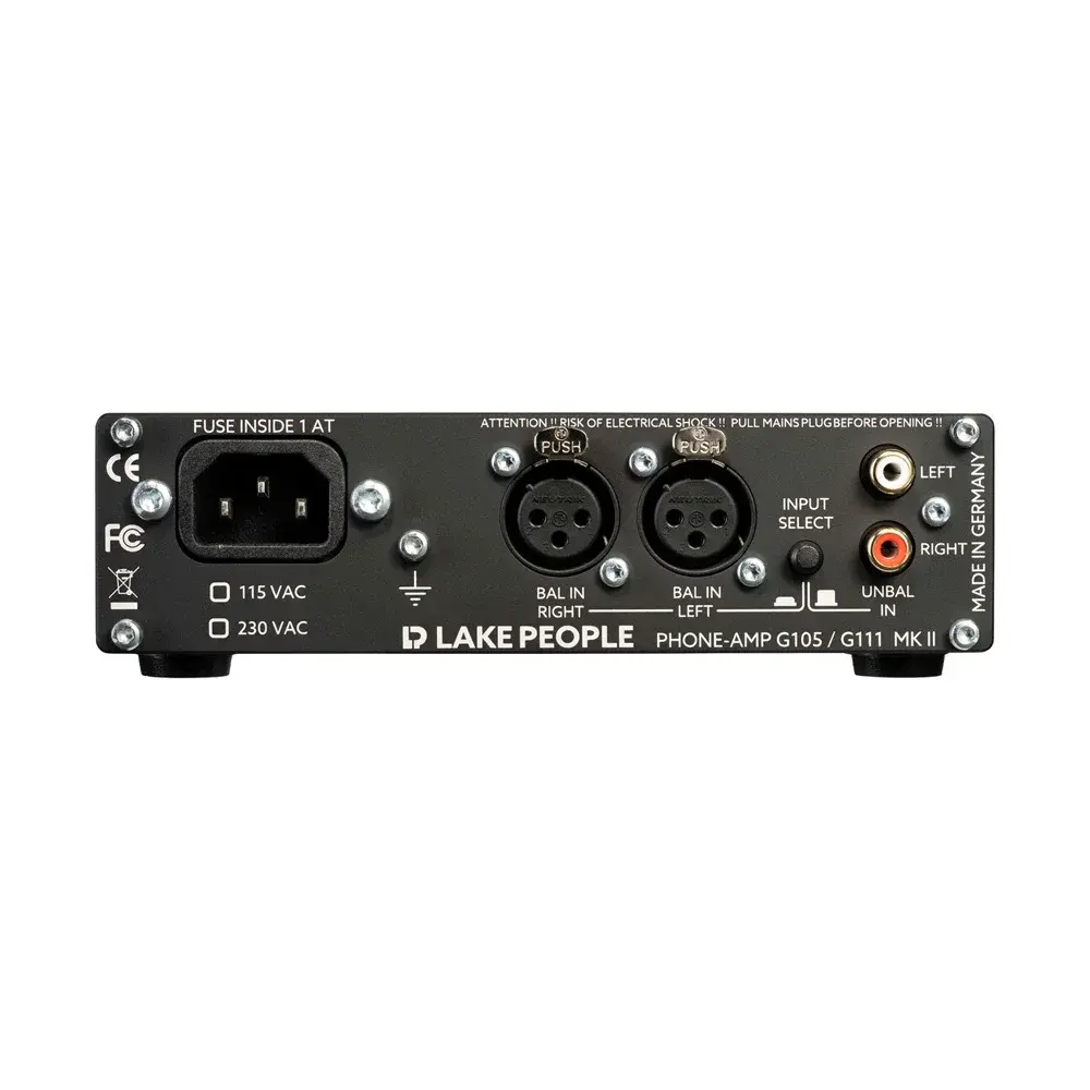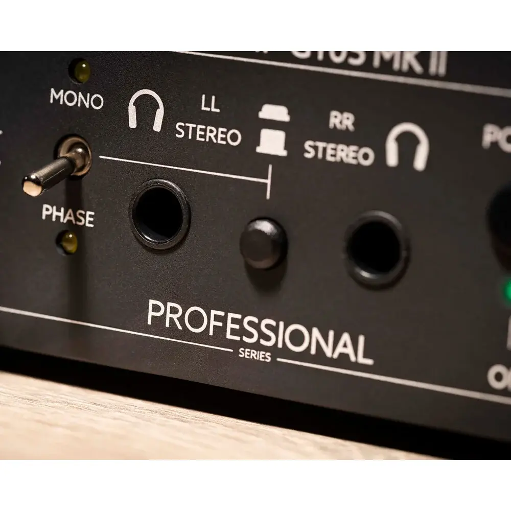 Входы расположены на задней панели, они оснащены электронно-симметричными разъемами XLR. На передней панели предусмотрены два регулятора для контроля уровня и баланса. G105 MKII оснащен двумя выходами для наушников с разъемами 6.3 мм, которые можно оптимизировать для моносигналов с помощью сплит-переключателя.