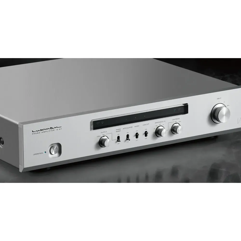E-07 оснащен функцией артикуляции, которая использует ток сигнала воспроизводимой пластинки для размагничивания картриджа или MC-трансформатора, переключателем низких частот, который подавляет колебания низкочастотного динамика за счет снижения низких частот, вызванных деформацией пластинки, переключателем монорежима, который удобен при воспроизведении монофонических записей, и переключатель инверсии фазы на передней панели, который изменяет фазу сбалансированного выхода в соответствии с подключенным устройством.
