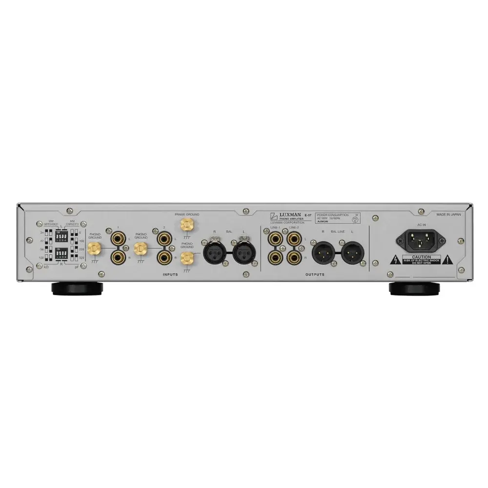 E-07 был разработан на основе лучших разработок компании Luxman в области схемотехники усилителей, которые разрабатывались на протяжении многих лет, и щедрого инвестирования ее ноу-хау в жанр усилителей с фоноэквалайзером, которые обрабатывают самый низкий уровень музыкальных сигналов среди аналоговых аудиопродуктов. Схема усилителя оснащена специальным эквалайзером типа NF, совместимым с кривой RIAA, совместимым с MM/MC, с высоким соотношением сигнал/шум, который обеспечивает низкий уровень шума за счет параллельного подключения 4 полевых транзисторов первого каскада.