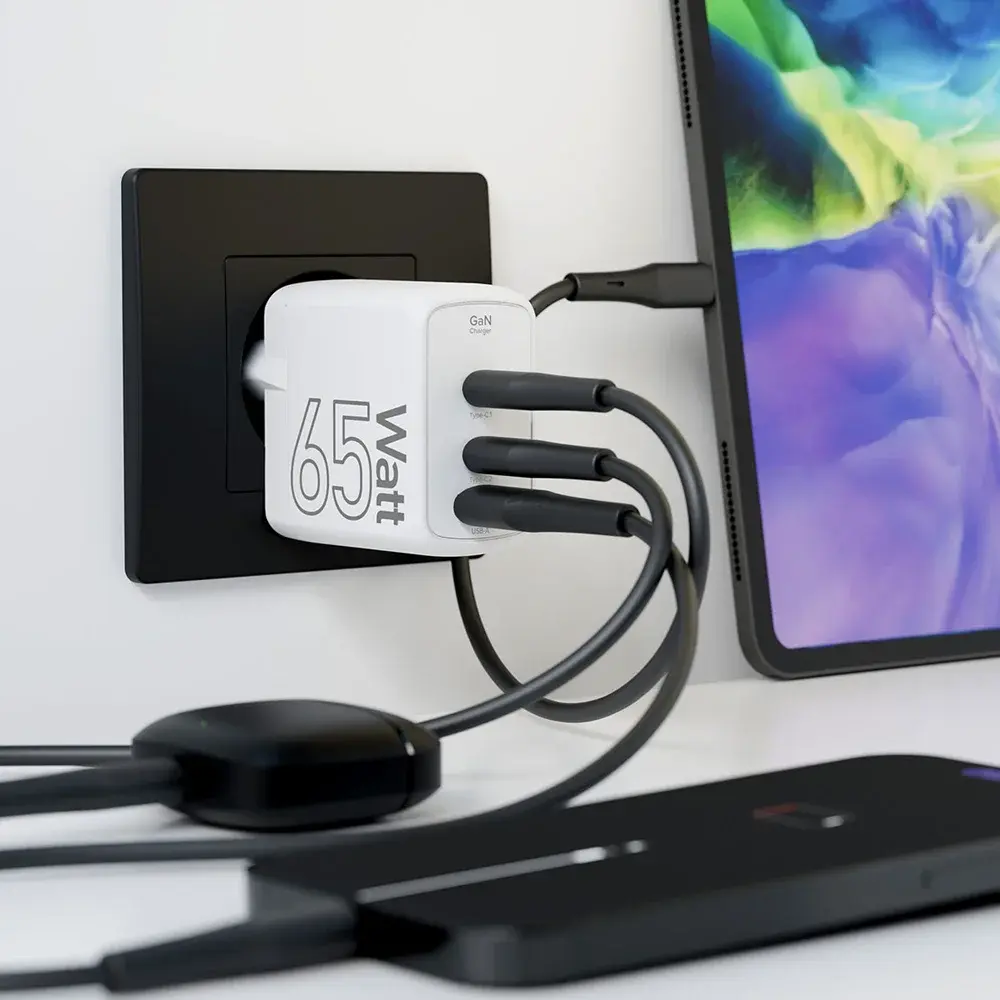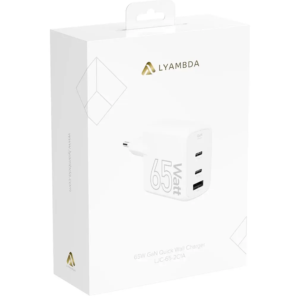 Быстрое сетевое зарядное устройство Lyambda 65Вт GaN c 3-мя выходами: 2xUSB-C Power Delivery (65Вт) и 1xUSB-A Quick Charge (18Вт). GaN — это прогрессивный полупроводниковый материал нитрид галлия.