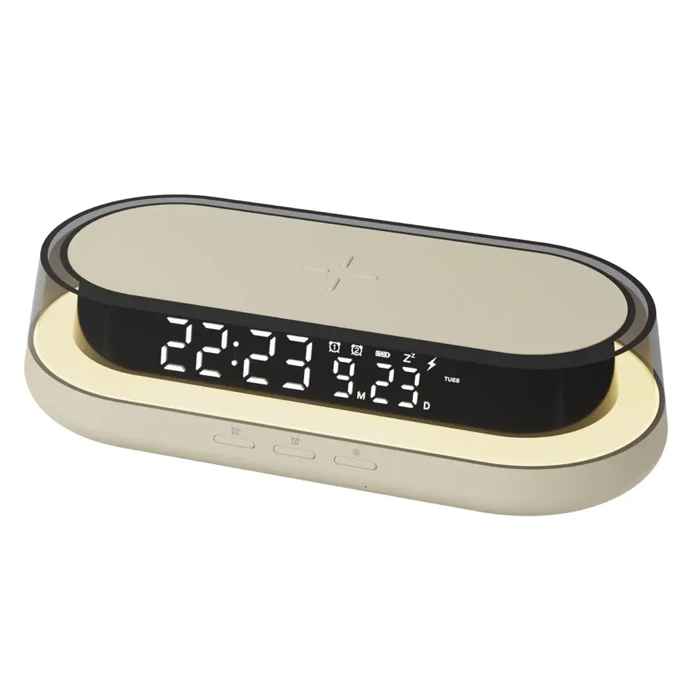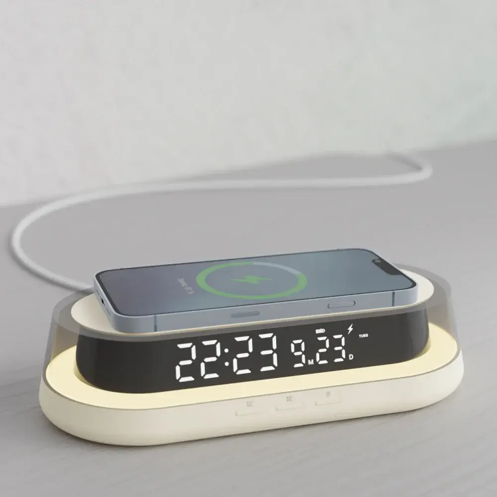 AURORA WCW-101 оснащены встроенным будильником, который поможет вам начать день вовремя, и функцией беспроводной зарядки с мощностью до 15 Вт. Больше никаких лишних проводов — просто положите телефон на часы, и он начнет заряжаться. Устройство поддерживает разные уровни мощности (5, 7.5, 10 и 15 Вт), что делает его совместимым с большинством современных смартфонов.