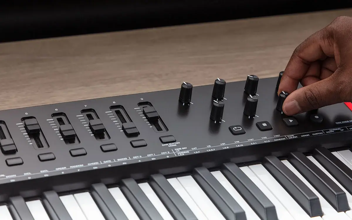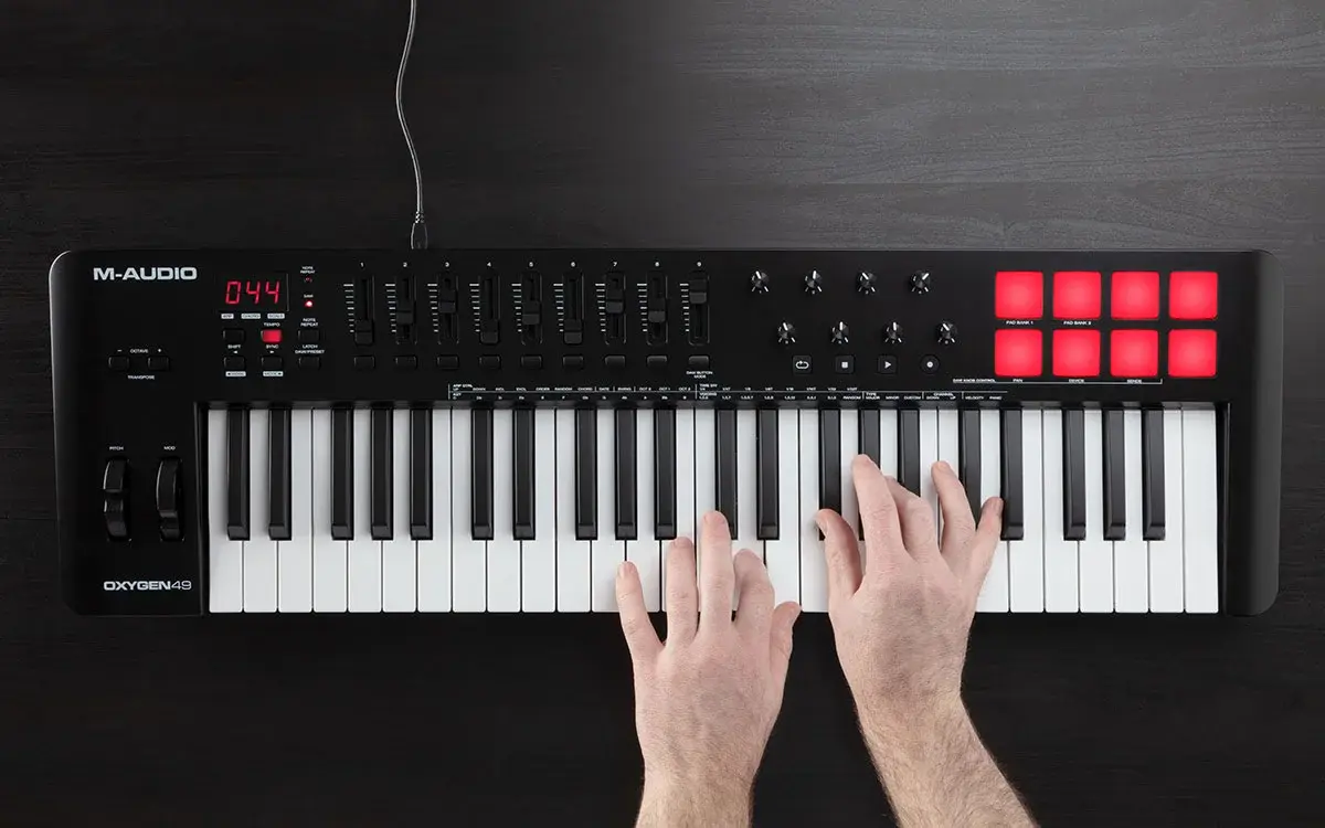 Контроллер Oxygen 49 (MKV) включает в себя мощные функции, необходимые для создания и производства музыки, такие как Note Repeat (для бит продакшена), полное управление скоростью нажатия клавиш и 8 пэдов, 8 назначаемых регуляторов для управления эффект плагинами и виртуальными инструментами, а также 9 назначаемых фейдеров для микширования: всё это открывает мир для точного создания музыки, делая ваш сигнатурный звук профессиональным и современным.