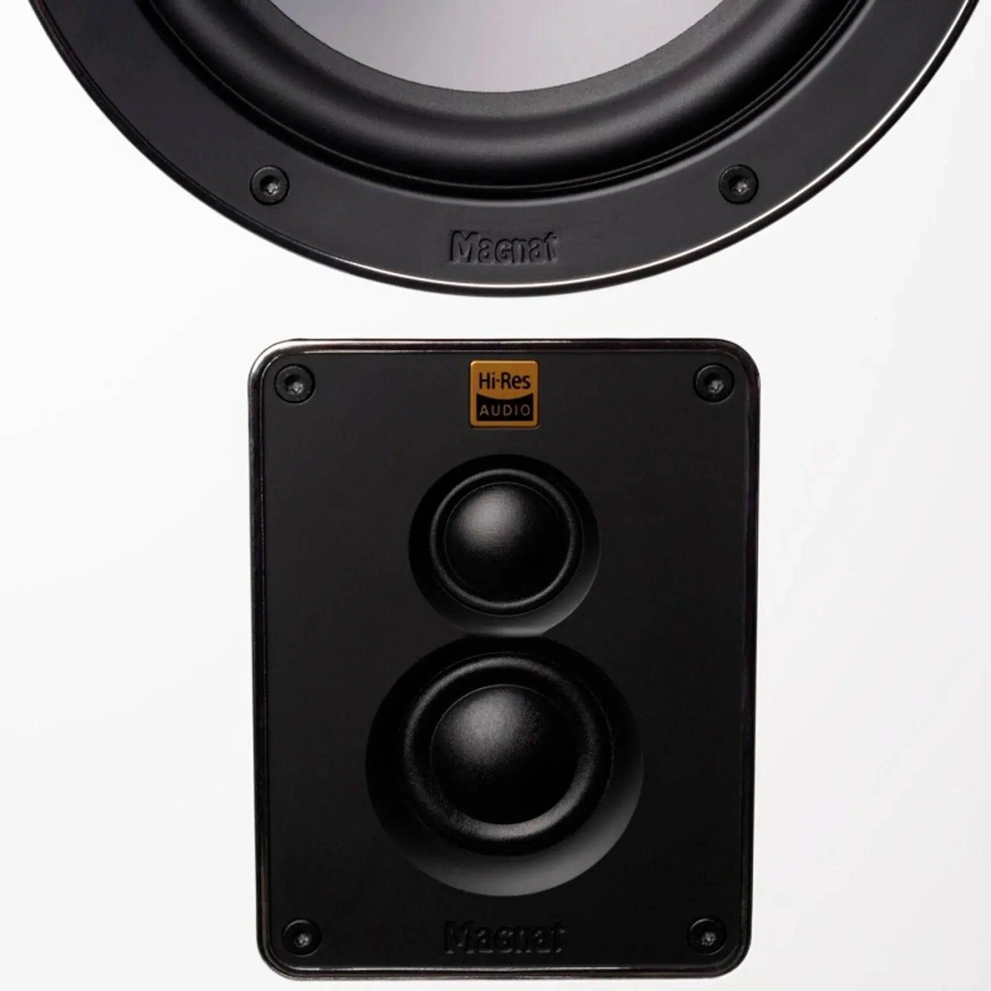 Высокочастотная секция в акустической системе состоит из двух твитеров разного диаметра. В этой комбинации твитер меньшего диаметра работает на высоких частотах, выходящих за пределы слышимого диапазона. Воспроизведение сигнала обеспечивает наилучшую детализацию звука и воздушность стереокартины. Особенно заметны преимущества акустики с таким широким частотным диапазоном при воспроизведении композиций в форматах High resolution. Не случайно колонки Magnat Signature 809 получили сертификацию Hi-Res Audio. Твитеры в колонке выполнены по технологии FMaх для расширения дисперсии звуковых волн и нагружены на рупор, который повышает эффективность их работы.