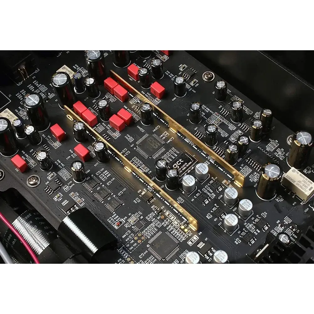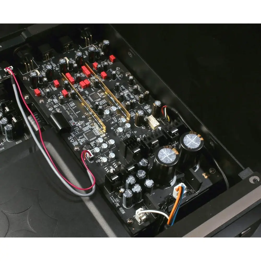 UDP900 оснащен 6-слойной основной печатной платой, оснащенной кварцевым генератором со сверхнизким уровнем шума TXCO с температурной компенсацией, который повышает точность и шумовые характеристики источника питания LDO (low dropout). Источники питания LDO не переключаются, поэтому при переключении не возникает шума, что обеспечивает максимально чистое качество звука. Используются аудиокомпоненты высокого класса от Murata, TDK и Elna. Аудиоплата состоит из четырех уровней, и каждый канал независим.