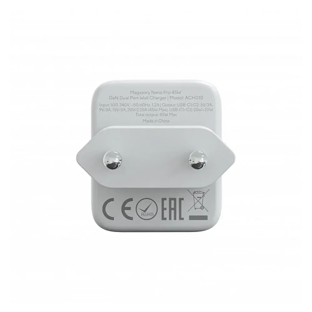 Magssory Nano Pro 45W GaN - сетевое зарядное устройство. Эффективный сетевой адаптер обеспечивает быструю и безопасную зарядку для всех совместимых устройств. Использование инновационного чипа GaN позволяет достичь высокой мощности до 45 Вт. Устройство поддерживает последние стандарты зарядки для оптимальной производительности.