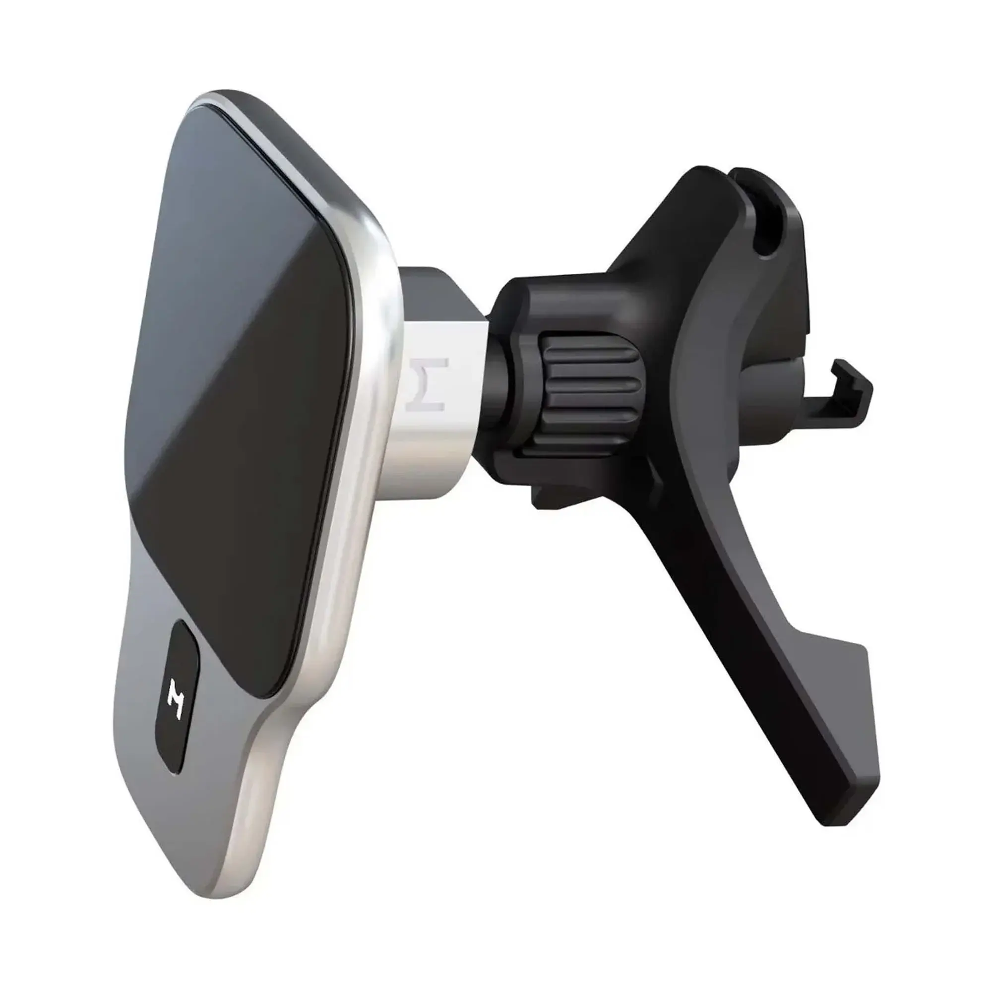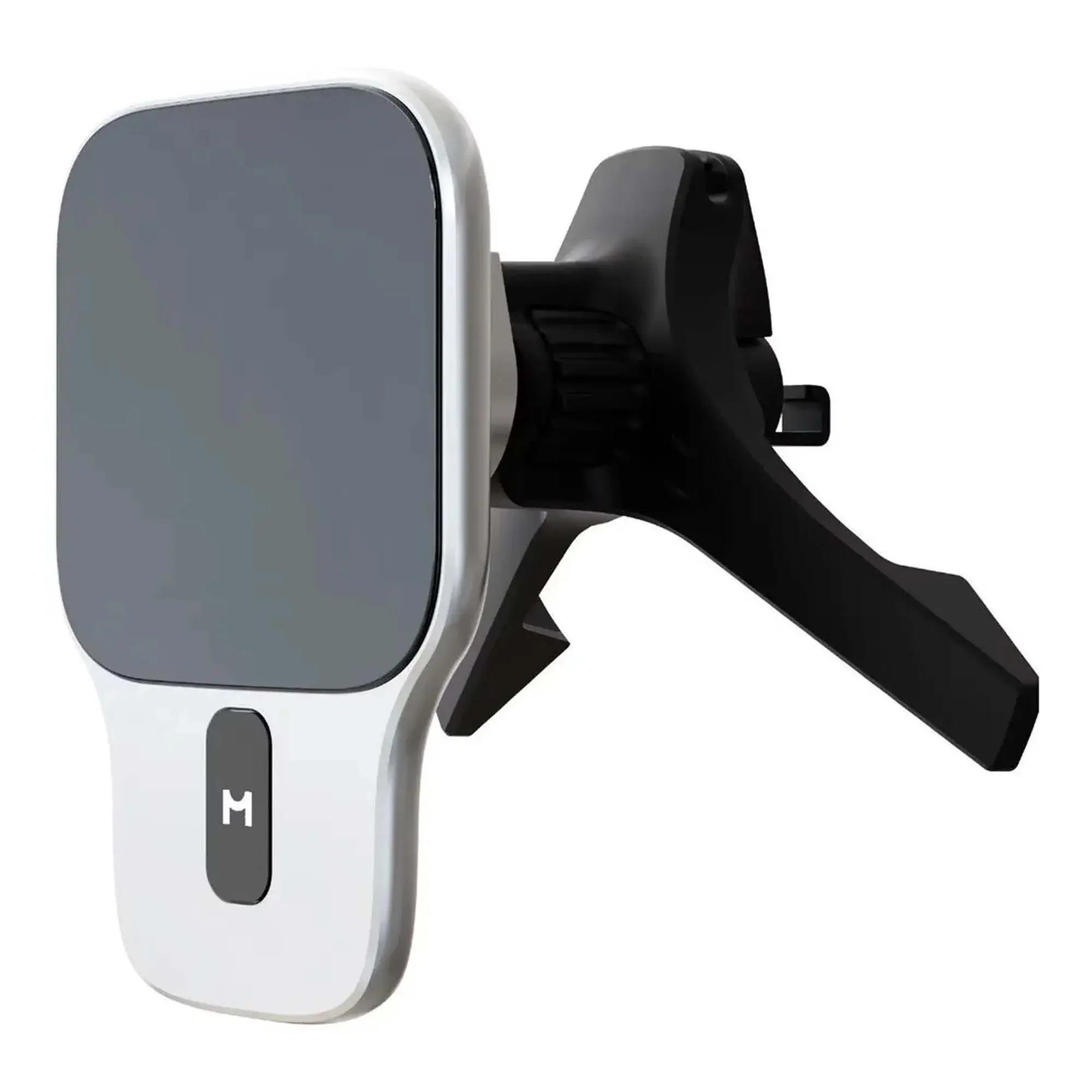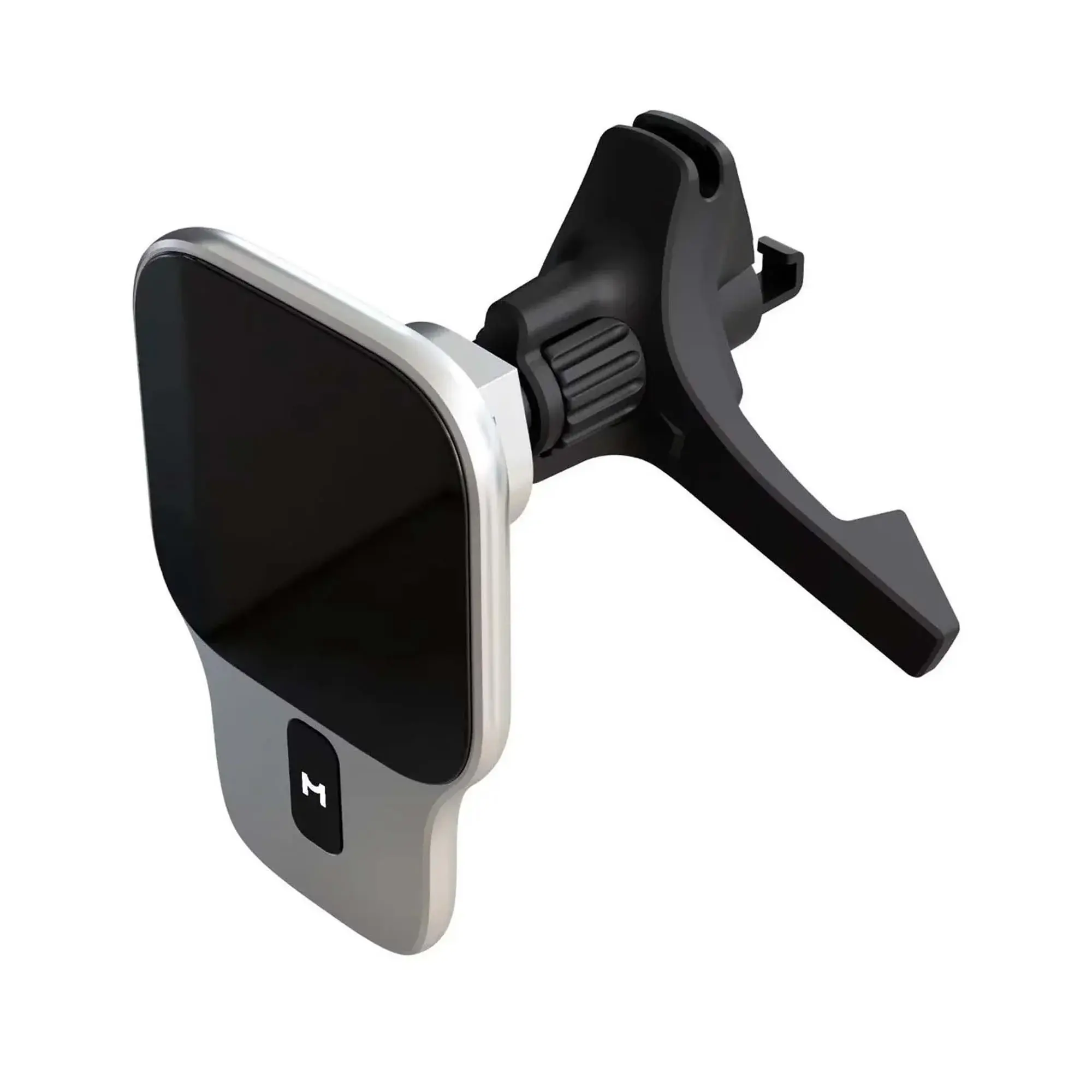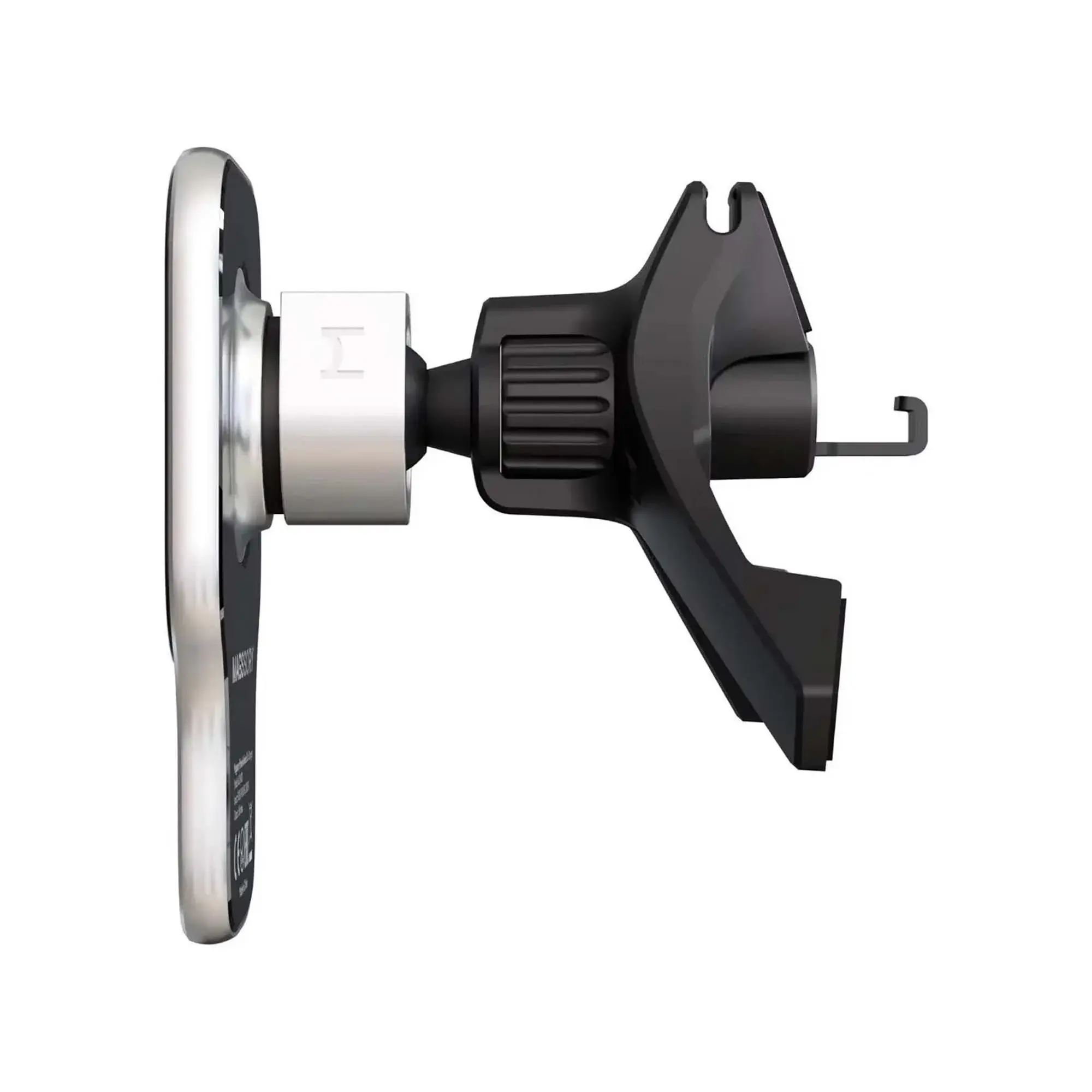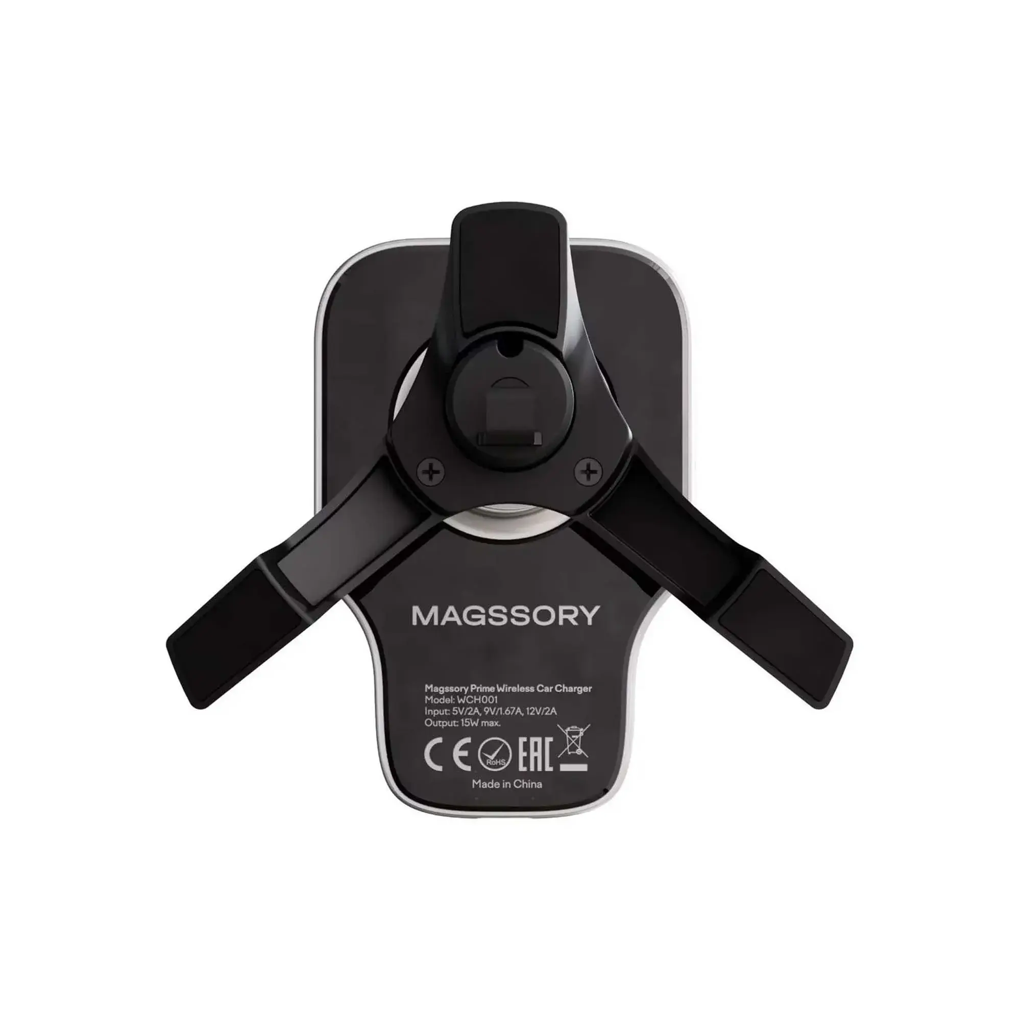Magssory Prime Magsafe — держатель для вашего автомобиля со встроенной беспроводной зарядкой. Телефон крепится на магнитах, которые выдерживают до 2.5 кг нагрузки. Даже на при резком торможении устройство останется на месте и не соскользнем куда-нибудь под сиденья, отвлекая вас от вождения. Аксессуар поддерживает быструю зарядку (15 Вт) Qi, PD, QC и совместим со всеми устройствами с MagSafe.