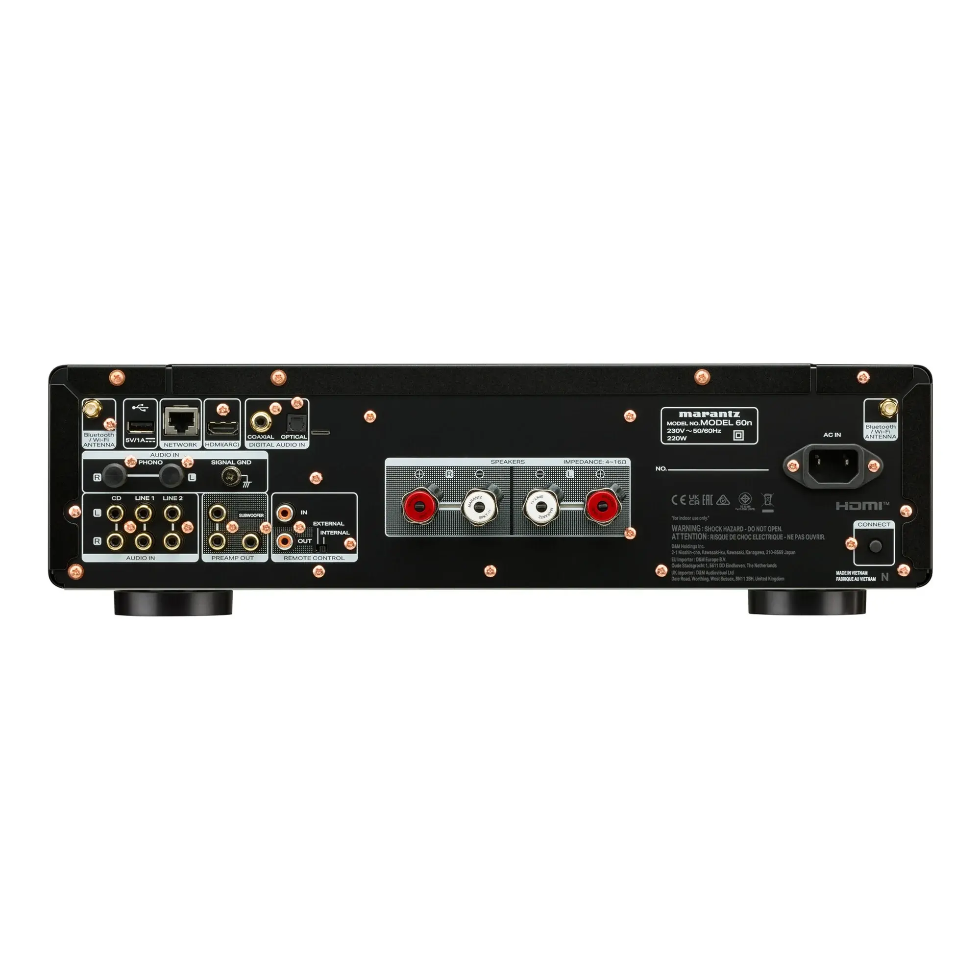 Marantz Model 60N оснащен широким набором входов, среди которых можно отметить HDMI-разъем с поддержкой возвратного аудиоканала ARC. Также имеются оптический и коаксиальный входы, что делает усилитель хорошим выбором для использования в составе домашней AV-системы. Существует возможность подключения активного сабвуфера, а для подсоединения акустических систем задействованы две пары фирменных винтовых клемм Marantz SPKT-1+. Меломаны наверняка оценят наличие у Marantz Model 60N, помимо трех линейных входов, качественного встроенного фонокорректора для MM-звукоснимателя проигрывателя винила. Имеется и гнездо для наушников, установленное на фронтальной панели.