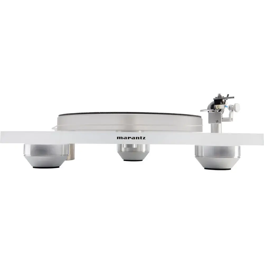 При первом же знакомстве Marantz TT-15S1 впечатляет своим великолепным утонченным дизайном. Устойчивое к резонансам изящное белое акриловое основание с фигурным вырезом в передней части и логотипом Marantz установлено на три массивные алюминиевые ножки, развязывающие его с поверхностью. Опорный диск толщиной в 30 мм, изготовленный из акрила GS-PMMA, обработанный на станках с программным управлением и оснащенный фетровым матом, использует для своего вращения высокоточный керамический подшипник. В наборе также имеется специальный прижим Clever Clamp фирмы Southern Engineering, надевающийся на ось шпинделя для того, чтобы надежно зафиксировать виниловую пластинку. Благодаря этому также улучшается звуковое разрешение.