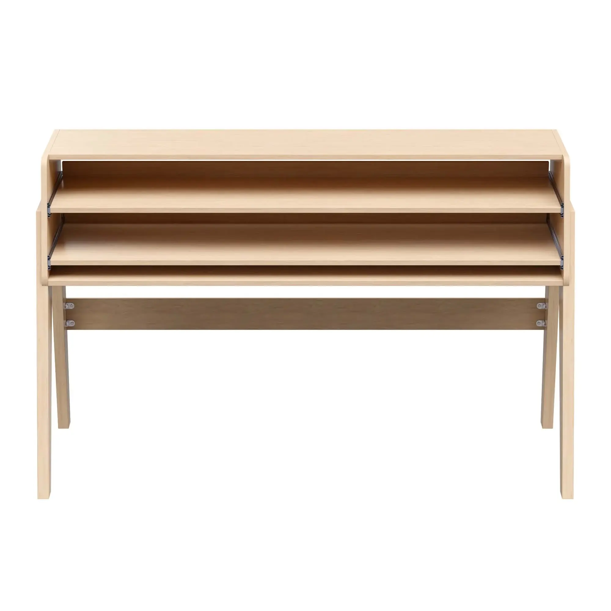 Стол имеет крепкую и стабильную конструкцию, способную выдержать интенсивное использование в домашней или профессиональной студии. На столе предусмотрен лоток для клавиатуры, размещенный на оптимальной высоте для комфортной работы. Пространство, отведенное для видеомонитора, достаточно велико, чтобы разместить 34-дюймовый экран между динамиками. Эта конструкция создана для использования одного монитора большего размера.
