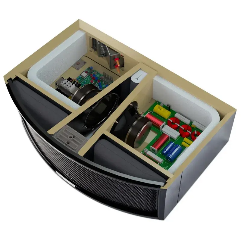 АС оснащена криволинейным источником звука (Curvilinear Line Source, или CLS). Он представляет собой электростатическую панель XStat малой высоты, расположенную вдоль передней стенки корпуса громкоговорителя. Небольшой изгиб в горизонтальной плоскости улучшает отдачу обманчиво компактной (732 см2) излучающей поверхности. В результате расширяется дисперсионная картина на средних частотах, поэтому звучание EM-ESL C и фронтальной стереопары, составленной из громкоговорителей ElectroMotion, оказывается предельно согласованным.-
