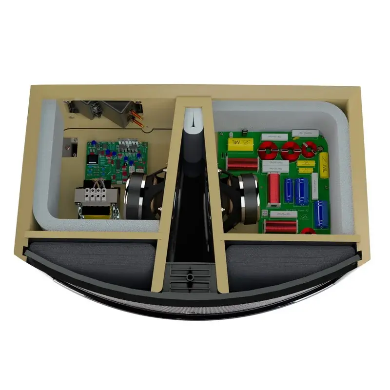 Непосредственно за электростатической панелью, в специально спроектированном отсеке, размещается фирменный твиттер Folded Motion. Легкая диафрагма твиттера звучит с минимальными искажениями, а ее короткий ход обеспечивает молниеносный отклик на входной сигнал. Полная площадь диафрагмы 1 x 1,4-дюймового твиттера Folded Motion в колонке EM-ESL C составляет 9 см2, что гарантирует воспроизведение тончайших нюансов, а это — одно из неотъемлемых условий успешной работы центрального громкоговорителя.