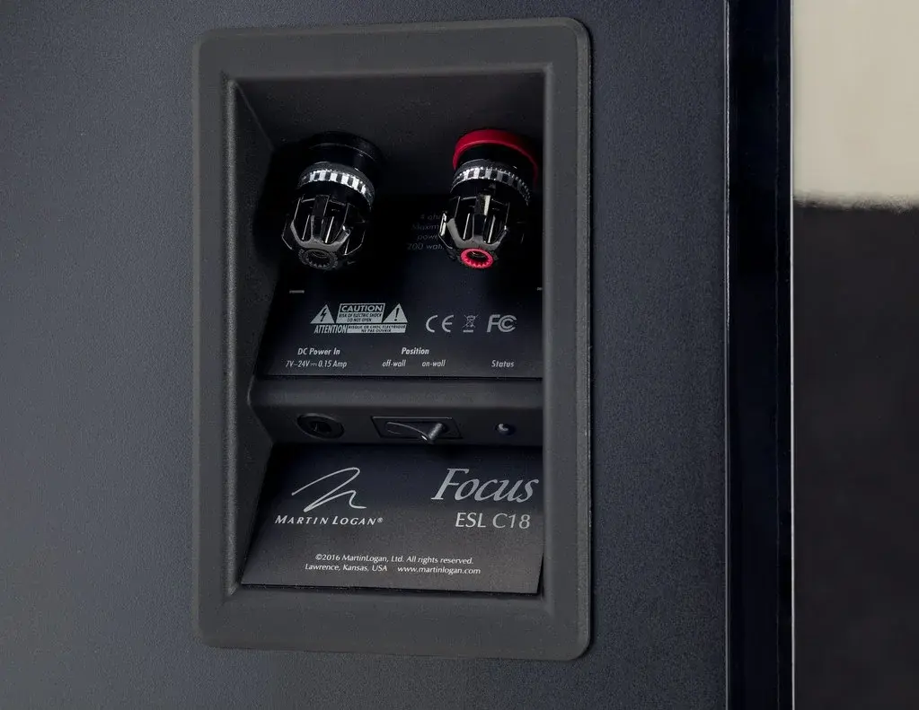 Сразу за электростатической панелью, закреплённой в корпусе уникальной конструкции, находится эксклюзивный ВЧ диффузор MartinLogan. Лёгкая диафрагма ВЧ диффузора сводит к минимуму искажения, а его короткая длина хода обеспечивает молниеносный отклик на высоких частотах. 1 x 35 мм гофрированный ВЧ диффузор в колонке центрального канала Martin Logan Focus ESL C18 имеет площадь диафрагмы 133 мм x 44 мм. Комбинированные рабочие характеристики электростатической панели и гофрированного ВЧ диффузора обеспечивают точное и сверхреалистичное смешение фронтальной сцены. Таким образом, Focus ESL C18 также оснащён пассивным массивом из двух 165 мм низкочастотных динамиков, способных воспроизводить глубокие басы до 50 Гц.